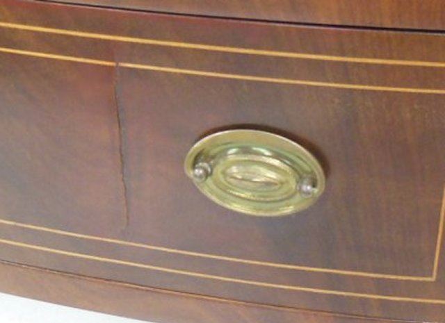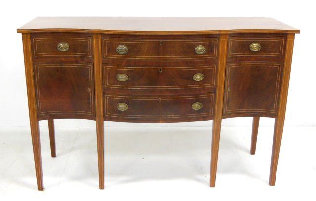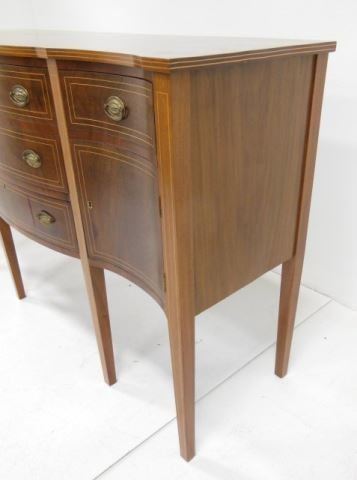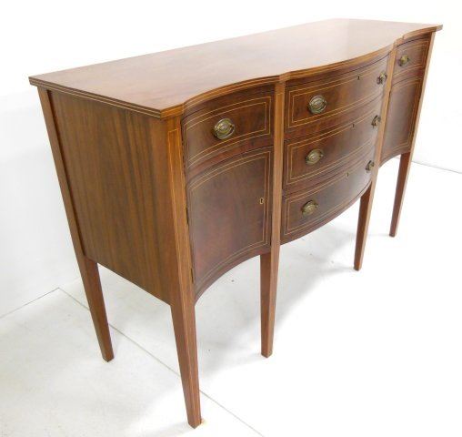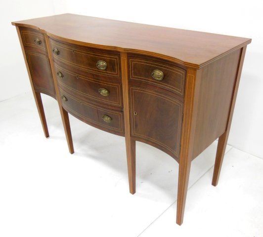 Pencil inlaid drawers, serpentine front. Ca. 1940's. Approx. 21" D x 60" x 39.75" W. (3392)