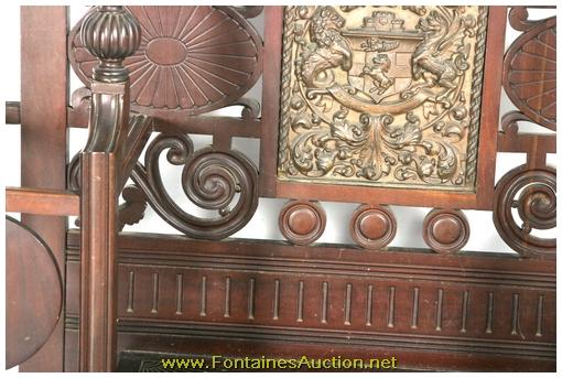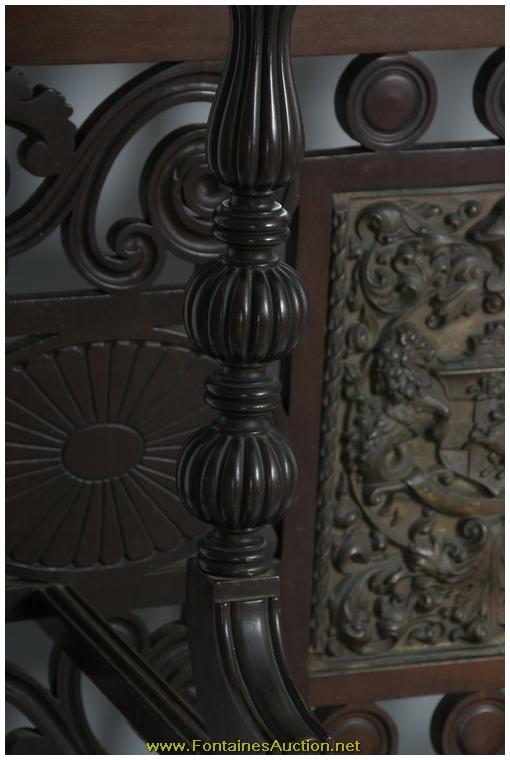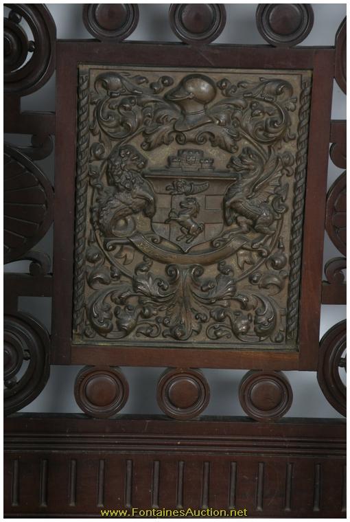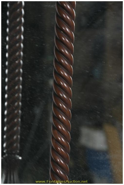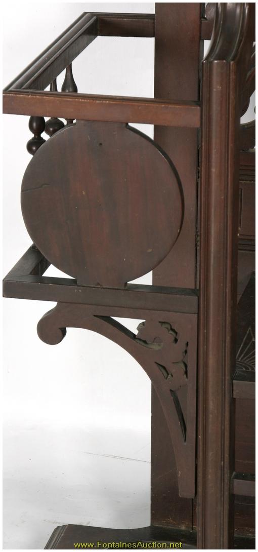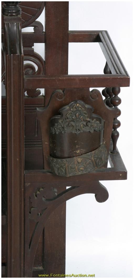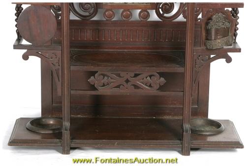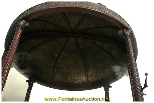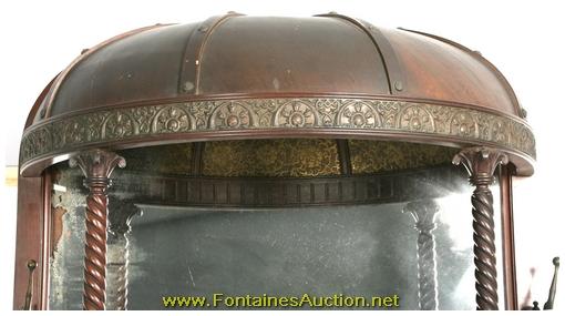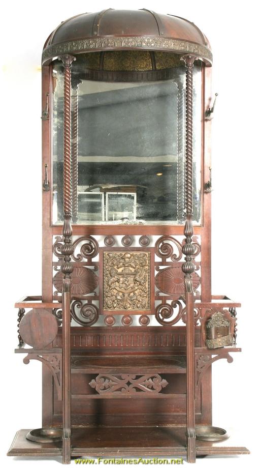 Mahogany Hooded Hall Tree. Has a domical hood top with mahogany straps over a beveled mirror and fine spiral turned column supports, reticulated carved back with a family crest center panel, spindled side arm umbrella stands with metal umbrella pans in the base; 4 coat hooks. Original finish and overall good condition. 44"W x 88"H x 18"D. Estimated Value$2,000 - 3,000.