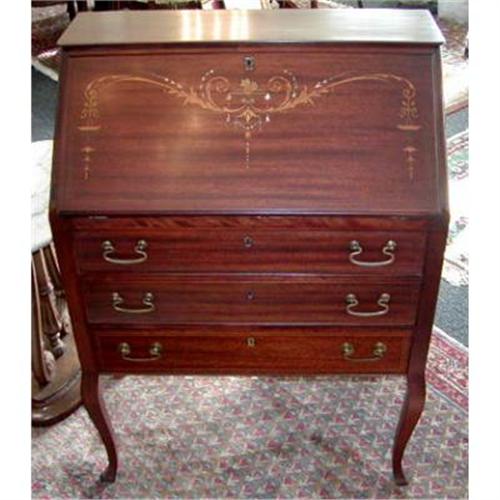 Lovely mahogany ladies' desk, fall front has beautiful inlay in a garland design along with mother-of-pearl accents, all in wonderful condition. Three drawers, all with original hardware. This piece is in beautiful original condition free of any repairs. Middle drawer has minor fading to the finish. When open the desk measures 28.5" deep.