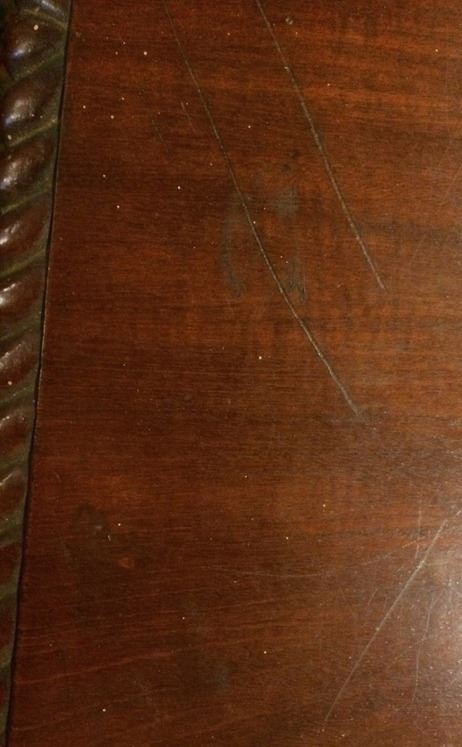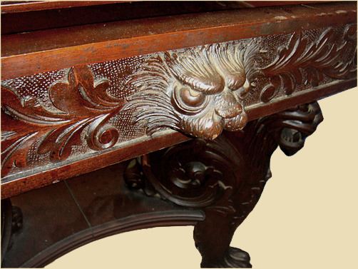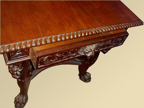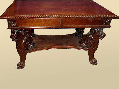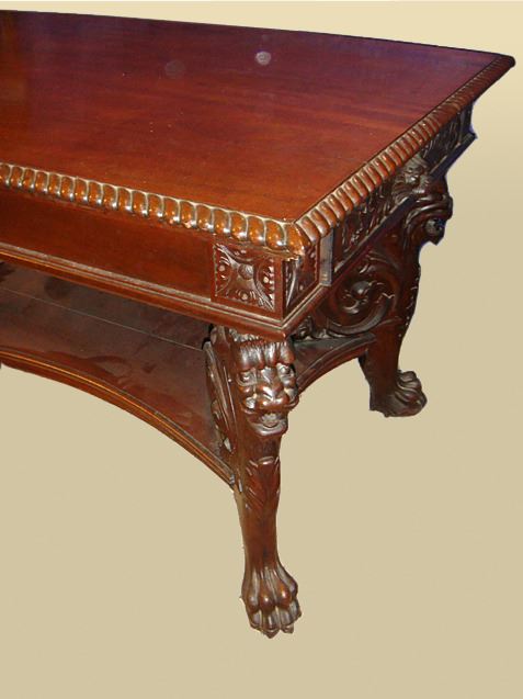 Mahogany Fully Carved winged griffin Library Table, drawers at either end with carved North Wind Faces, rope twist apron top. Huge claw feet original finish. 29 in. tall 31 in. wide 48 in. long. Attributed to R. J. Horner. Base from the feet 27 in. wide, 44 in. on the base of the feet. Griffins are 22 inches tall. This is a magnificant table, heavily carved, with original finish.