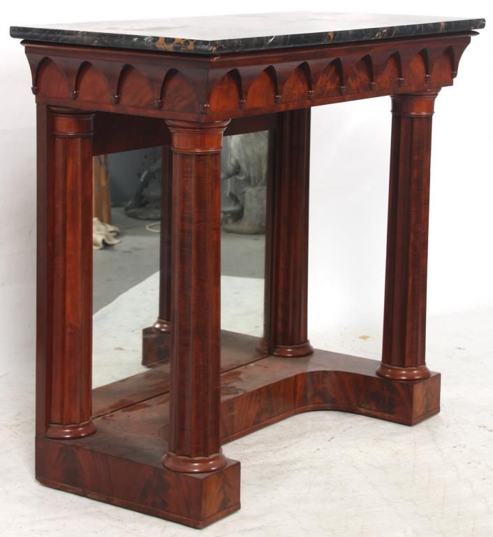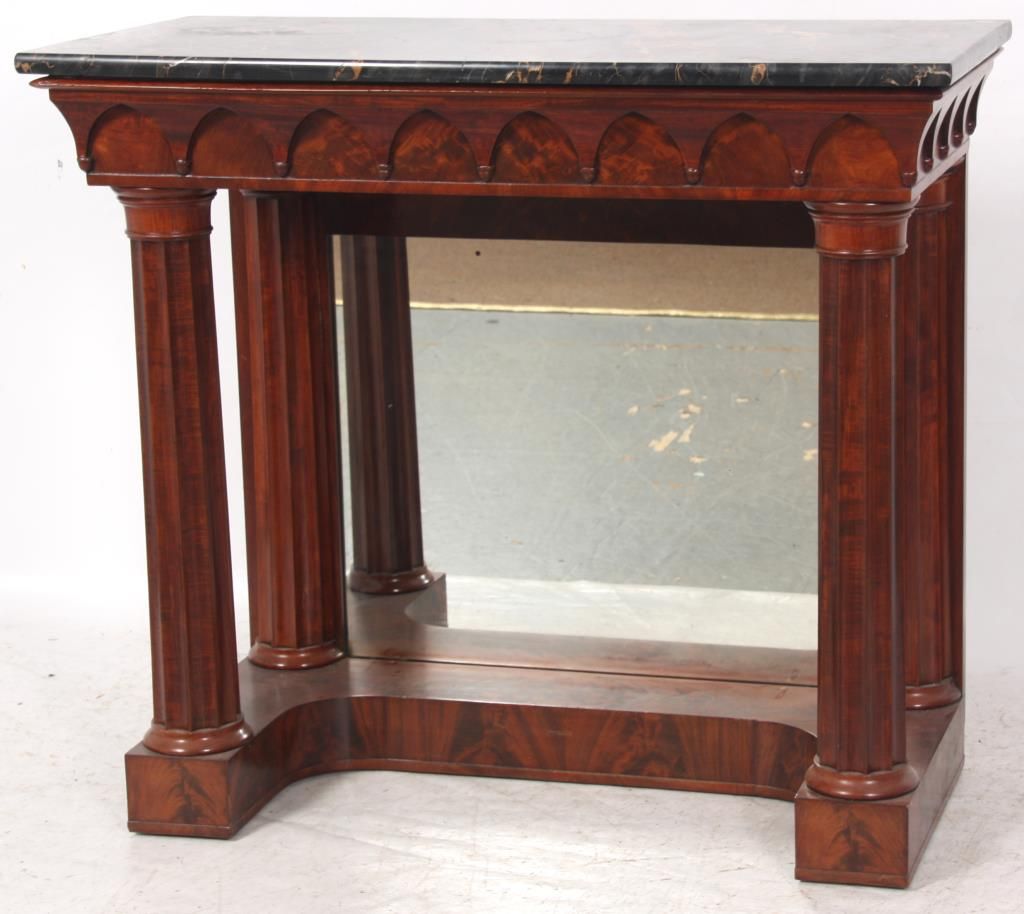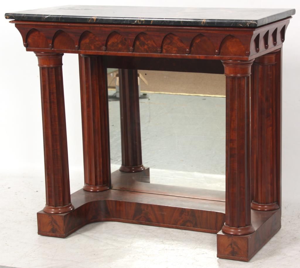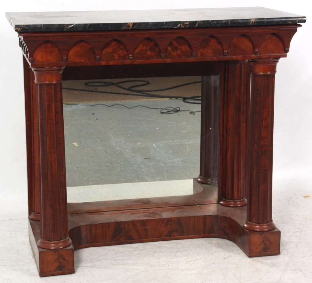 Mahogany Marble Top Pier Table. Black marble top with carved gothic arched apron with inverted acorn turnings at the points; large turned and fluted column supports in the front and half columns on either side of the mirrored back. Flame grained mahogany veneer with a cleaned & polished original finish; marble is repaired. 36 in. high x 40 in. wide x 18.5 in. deep.