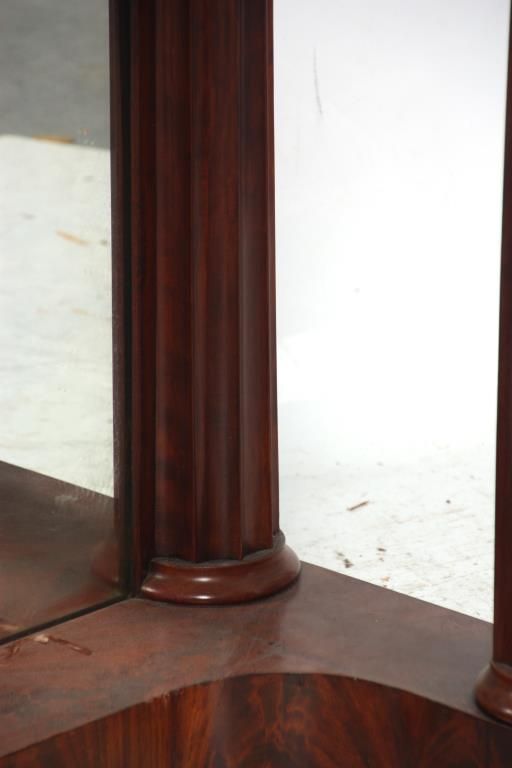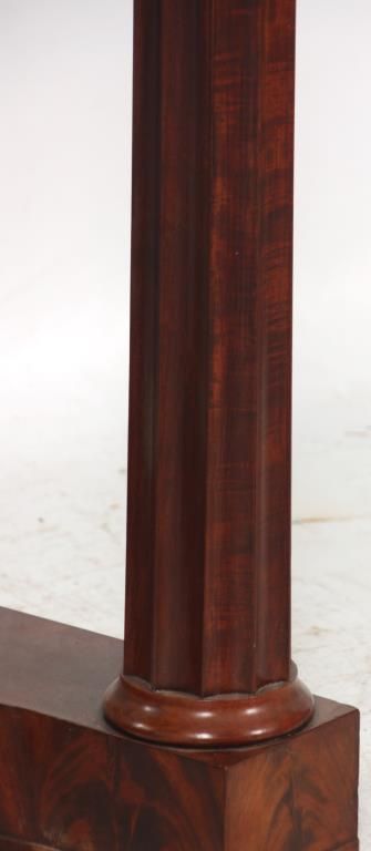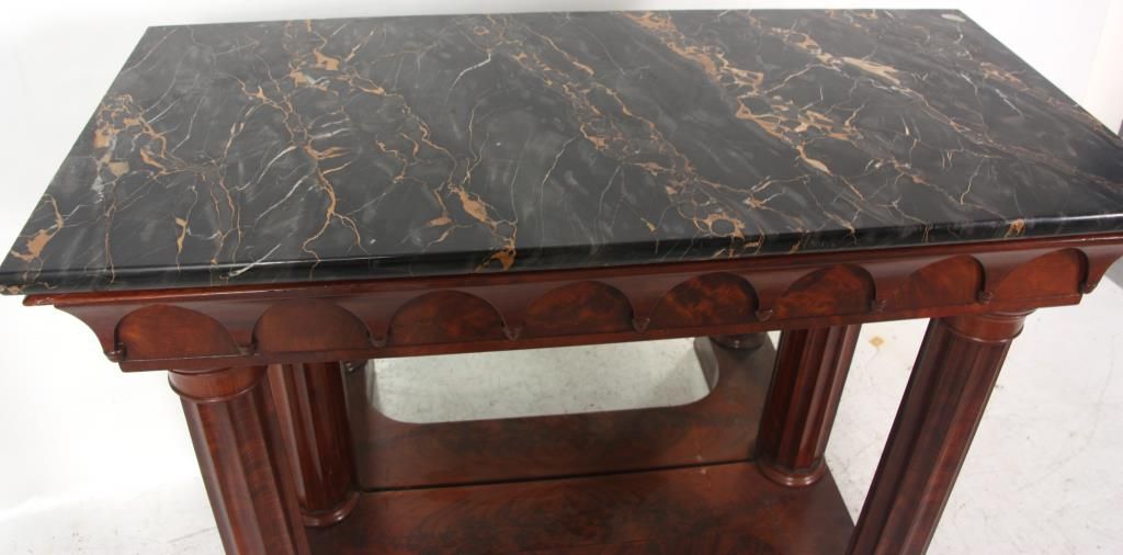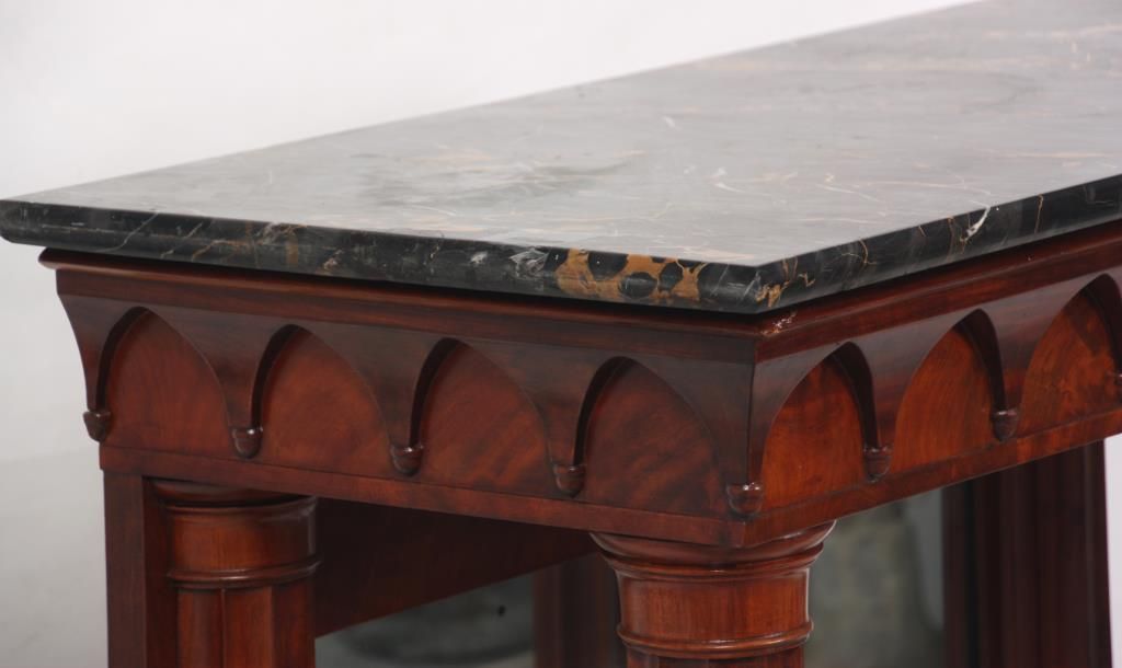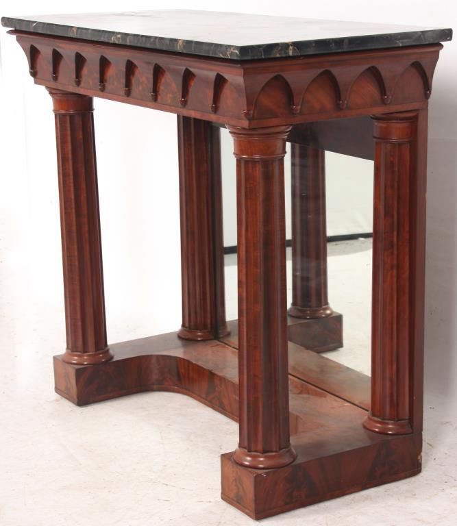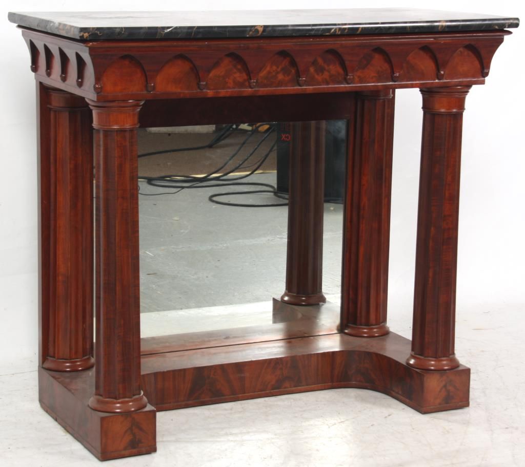 Mahogany Marble Top Pier Table. Black marble top with carved gothic arched apron with inverted acorn turnings at the points; large turned and fluted column supports in the front and half columns on either side of the mirrored back. Flame grained mahogany veneer with a cleaned & polished original finish; marble is repaired. 36 in. high x 40 in. wide x 18.5 in. deep.