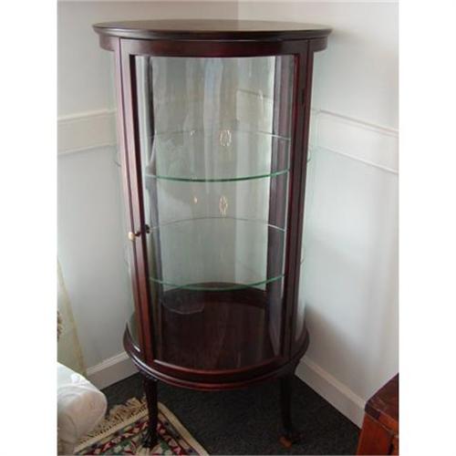 A unique find!! This beautiful solid Mahogany Curved Glass Oval Vitrine is absolutely lovely. Four curved glass panels, all wavy and original to the piece. One door with a turn knob. Two original 1/4" thick glass shelves to hold your collectibles. Lovely carved small paw feet. This piece is very delicate and unique. Wonderful original condition, no repairs nor chips/nicks to the glass. Great accent piece!