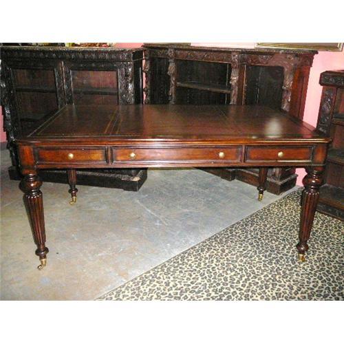 This is a fabulous leather topped maogany partner's desk computer desk with three drawers per side and fluted legs with brass casters.