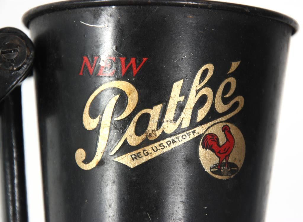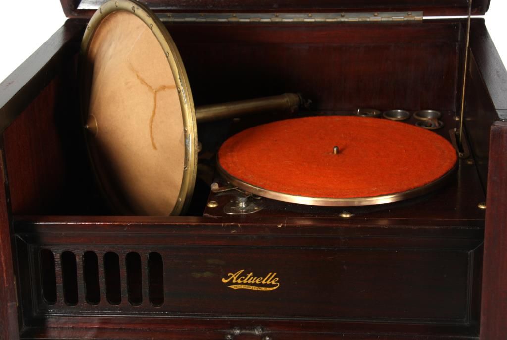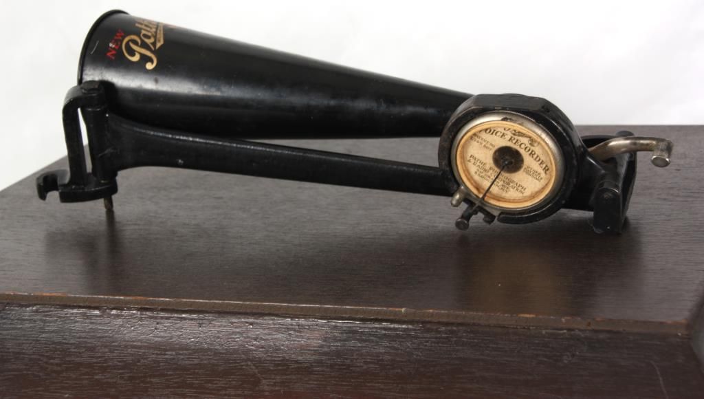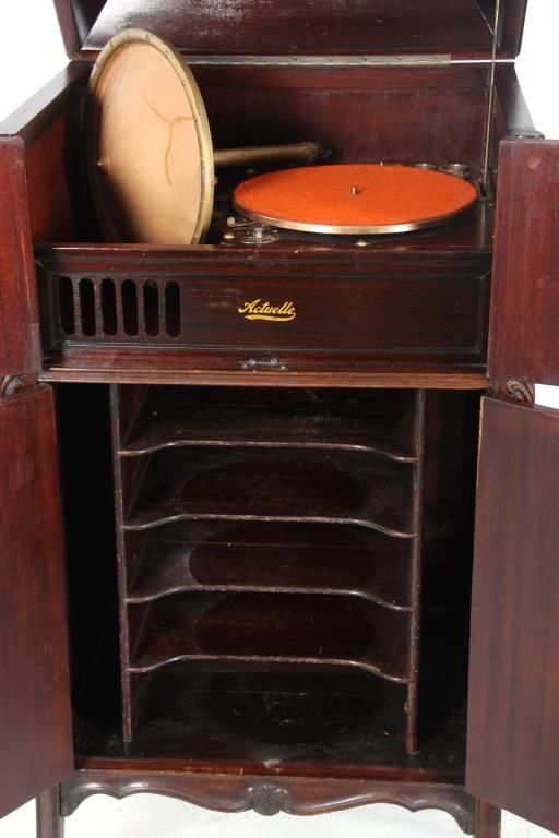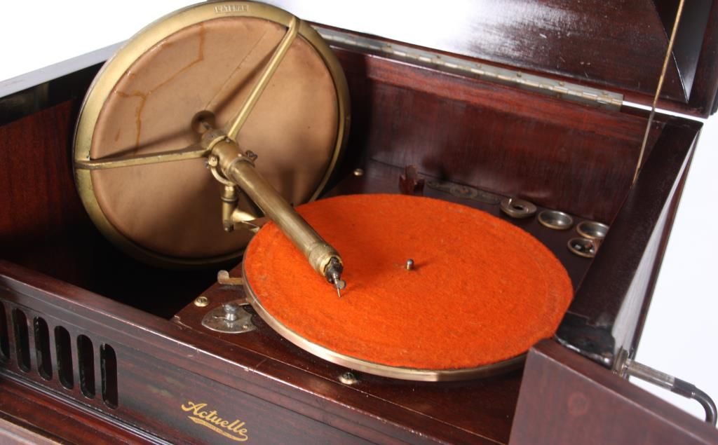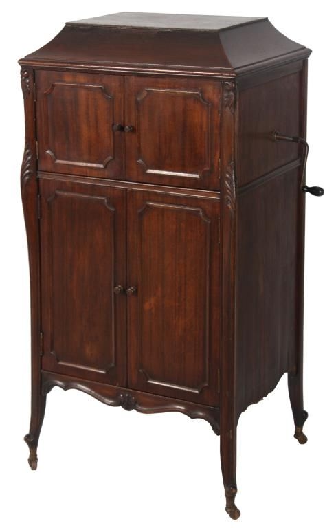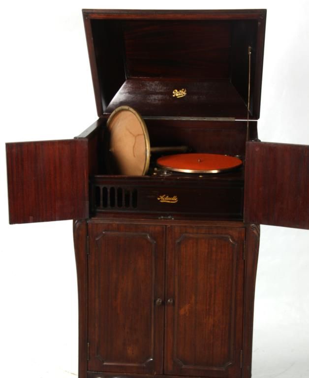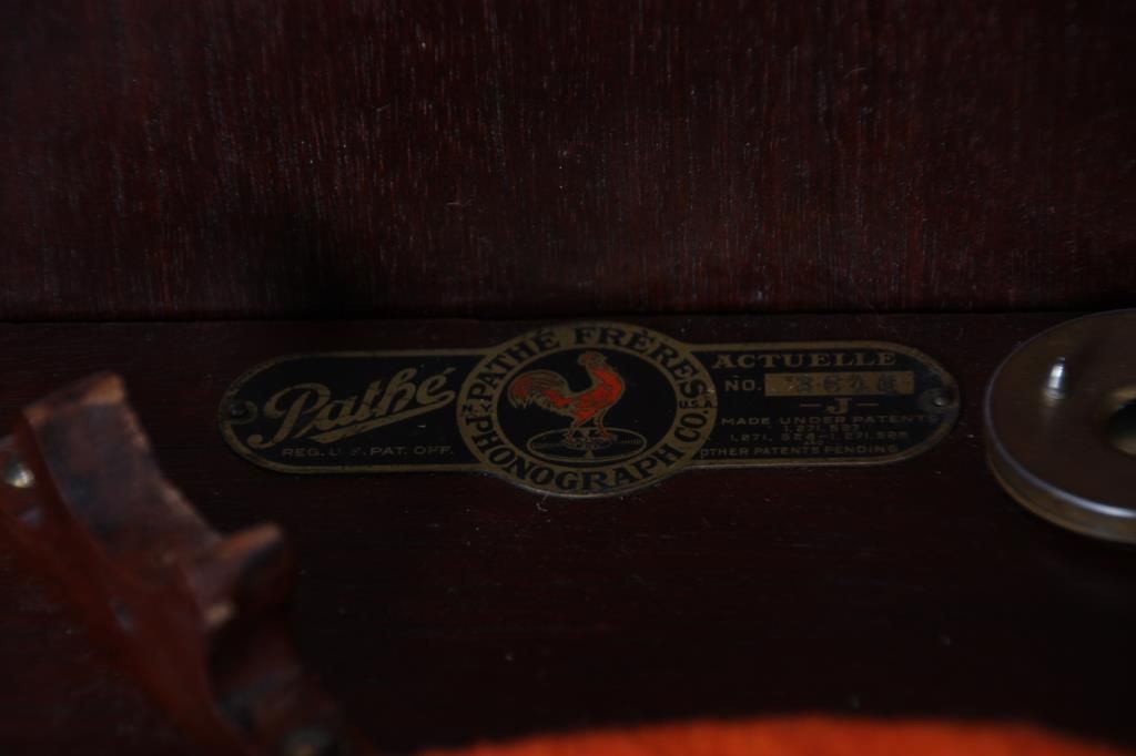 Mahogany Pathe Actuelle Floor Model Phonograph. Large mahogany floor standing case with pyramidal style lid, 2 doors over 2 doors in the front and leafy filigree carvings on the corners. Spring driven mechanism with crank wind on the right side, 12 in. turntable, brass tone arm with 12 in. paper mache speaker. Signed with Pathe decal under the lid, Actuelle decal on the front of the interior and brass tag for Pathe Freres Phongraph Co. with model “J” and serial number 3646. Also includes a Pathe voice recorder mechanism, with black painted tone arm and conical speaking horn, signed with “New Pathe” decal. 48 in. high x 25 in. wide x 19 in. deep.
