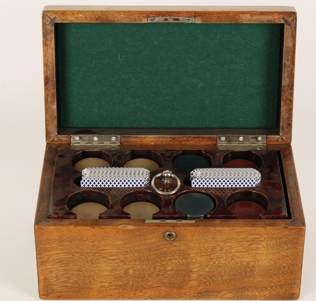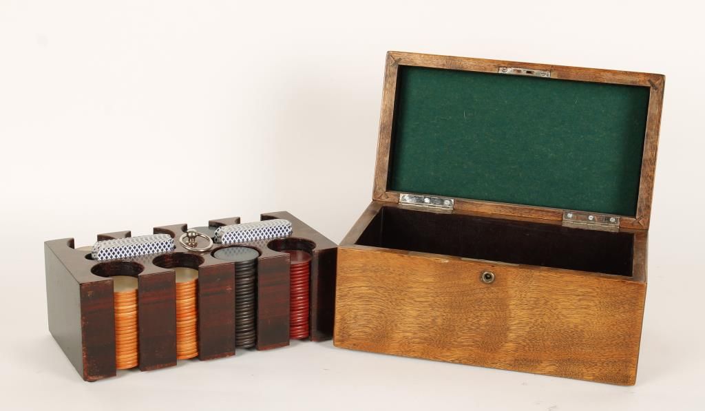 Chips. Four columns on each side of rack to hold poker chips, center holds two decks of cards.