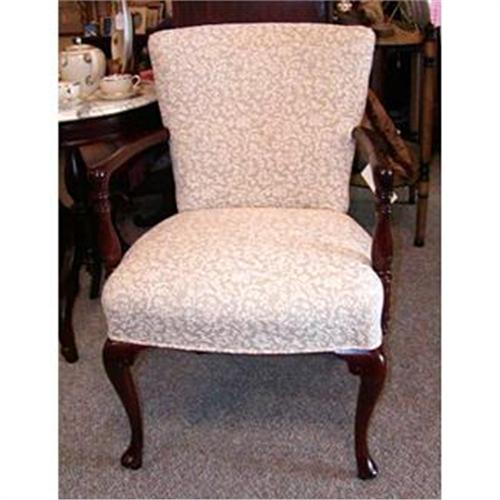 Beautiful Mahogany Queen Anne armchair c.1940, in great condition. Newly upholstered in a cream and taupe chenille. Very comfortable. Great side chair! Heighth of seat from floor is 17".