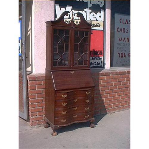 Mahogany Serpentine Drop Front Secretary. Measures 78" tall by 30" wide by 16" deep. Serpentine front with four draws. Item is in great condition overall except for a major piece missing from the front ball and claw leg. Picked up from estate that way, hopefully the missing piece can be found and repaired. But right now we are selling it as is. We are now told that it is not much to repair the leg piece. Still a very beautiful piece of furniture. We know shipping and fees, are high, so we try and keep our selling prices down were you can still buy. Enjoy
