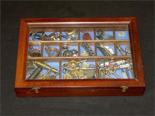 Belle petite vitrine en acajou avec un lot de clefs de montres et pendentifs, env. 50 pièces
