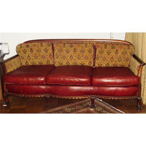 The beautiful sofa is from early 1900?s made of mahogany with claw foot legs and handsome apron in front. The sofa has been reupholstered with tapestry fabric and leather, the seat cushions are two sided as you can see in the picture.