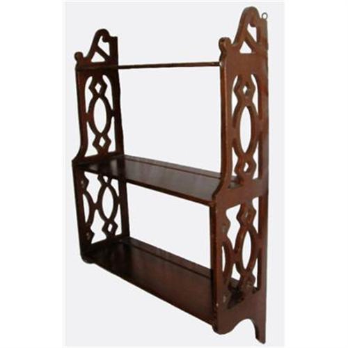This is a sturdy yet lightweight shelf made of mahogany in a rich brown stain. It is very practical, with three shelves. Made as a plate rack in the 1930's or 40's - there is a groove on each shelf for setting the plates. The cut-out wood detail on the sides is pretty and decorative. The top shelf is 4.75" deep, while the bottom two are both 6" deep. There is also a small metal ring at the top of each side for easy mounting on the wall. This could be used to display your fine plates or other favorite decorations. Brought to you by Sand Hill East.
