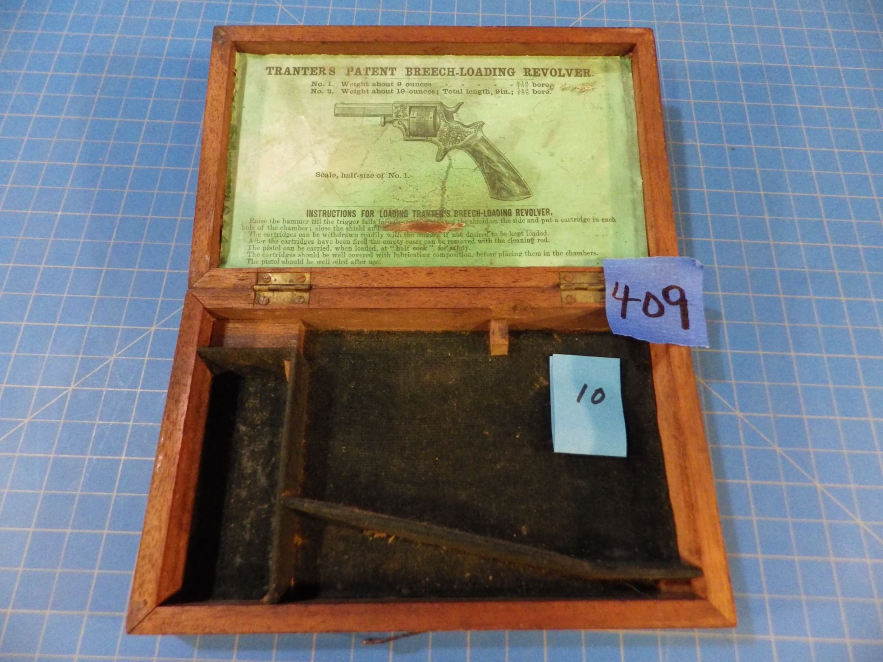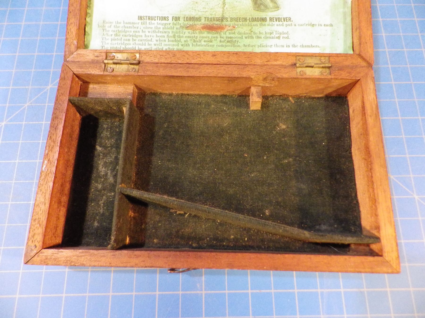 Mahogany case, 7 1/2" x 4 1/2" x 1 1/2" label "Tranters patent Breech-loading revolver" - CONSIGN # PC 10