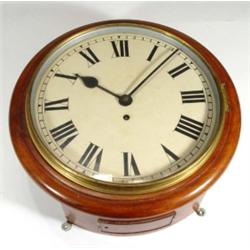 Mahogany cased fusee movement wall clock with painted enamel dial, 38cm diameter