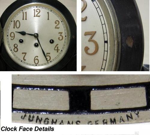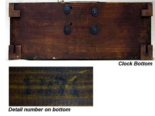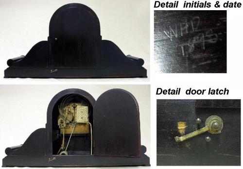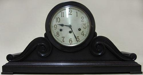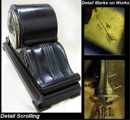 Mahogany cased mantle clock marked Wurttemberg on works; keywind; scroll decoration flanking bottom of dial; on rectangular base; square feet; marked Junghans Germany (marked on works and carved in wood back on door WHD 1898); C. 1898; measures 12 1/4" high x 24" across x 6 1/2" deep; (minor crazing and wear to finish near "3" on the face)