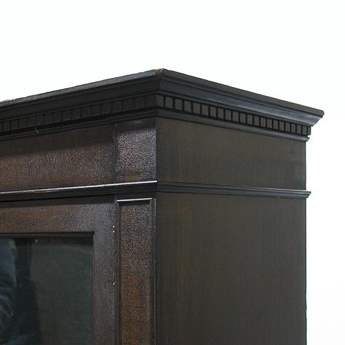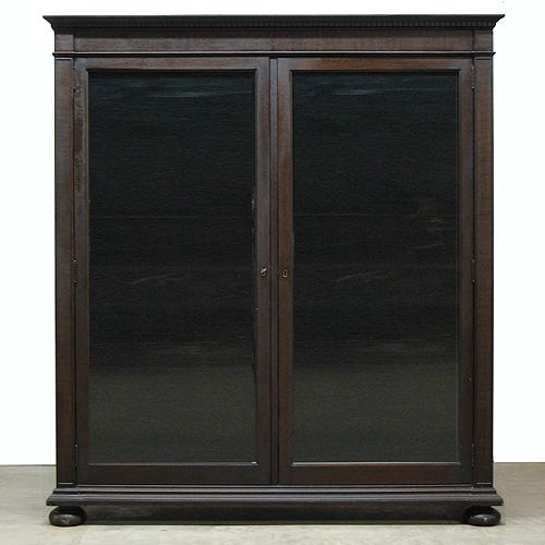 Mahogany double glass door bookcase; overhanging cornice over dentil molding above two glass locking doors; molded base with bun feet; C.1920; 59" high x 53" across x 14" deep (no visible defects)