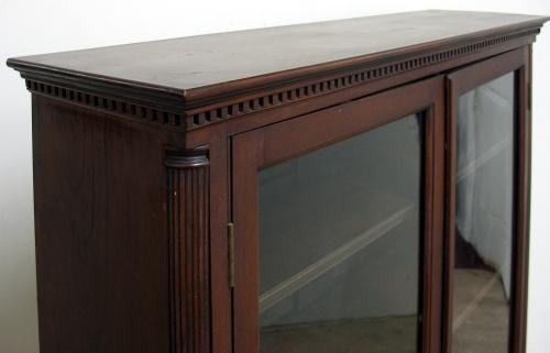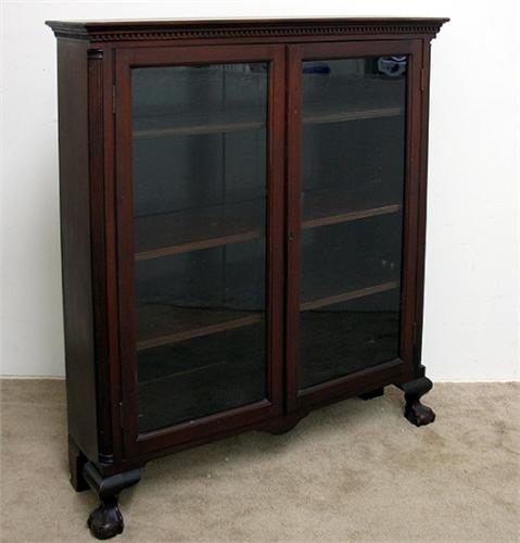 Mahogany double glass door bookcase; (the third of three matching bookcases) overhanging cornice with dentil molding over double glass doors; flanked by reeded quarter columns; on front ball and claw feet; early 20th C.; measures 50" high x 39 1/2" x 10 1/2" (one door with crack in glass at top right corner)
