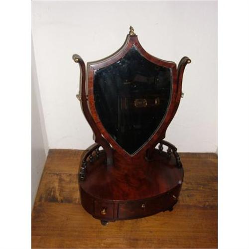A mahogany dressing mirror with a shield shaped plate and half gallery. Nice dovetail work on drawers.