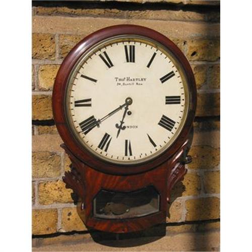 Fine figured mahogany and carved drop dial wall clock with visible pendulum by Thomas Hartley Bunhill Row circa 1860