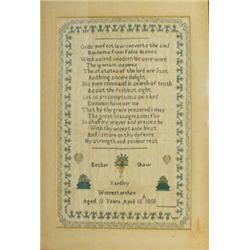 Mahogany framed rectangular Victorian sampler with verse 'God's perfect law converts the soul', Esther Shaw, Yardley Worcestershire, aged 11 years April 15 1850 with floral border, 60cm high