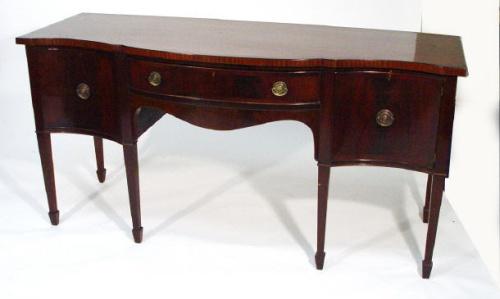 Mahogany serpentine fronted sideboard, fitted a central drawer flanked by a pair of cupboard doors on tapering legs, 93cm high, 183cm wide, 68cm deep