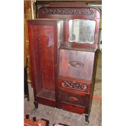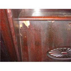Mahogany side-by-side with old finish. Measures 70 1/2" tall to top of back, 37 1/2" wide, and 12" deep. Missing some veneer on face of drop-front. Some surface scratching is visible.