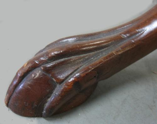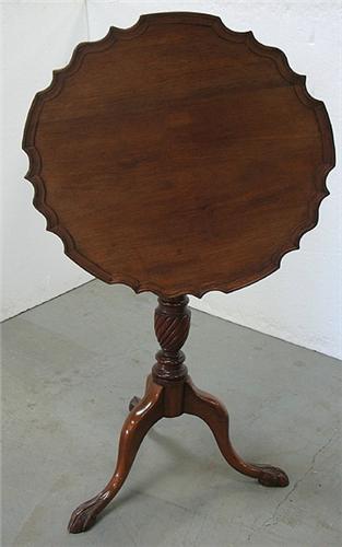 Mahogany tilt-top piecrust table; scalloped piecrust top; rope turned design on standard; three legs terminating in ball and talon feet; C. 1900; measures 27" high x 21" diameter (no visible defects)
