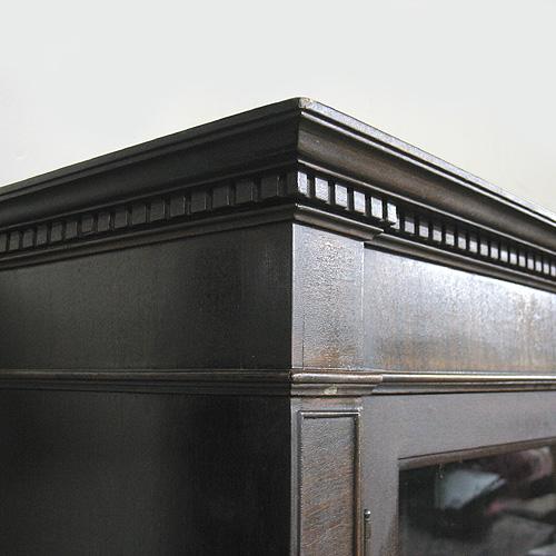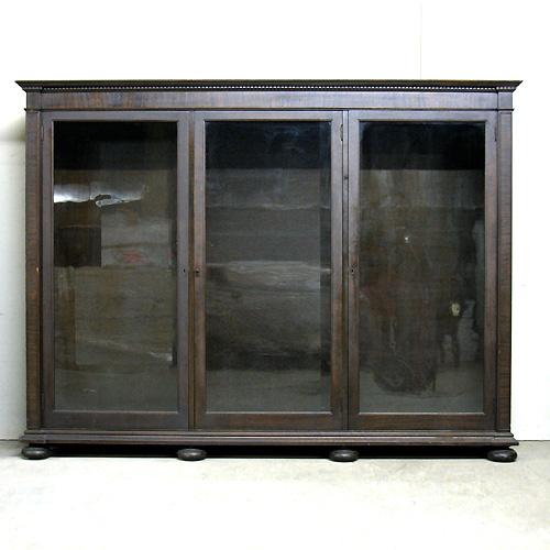 Mahogany triple glass door bookcase; overhanging cornice over dentil molding above three glass locking doors; molded base with bun feet; C.1920; 59" high x 77" across x 14" deep (no visible defects)