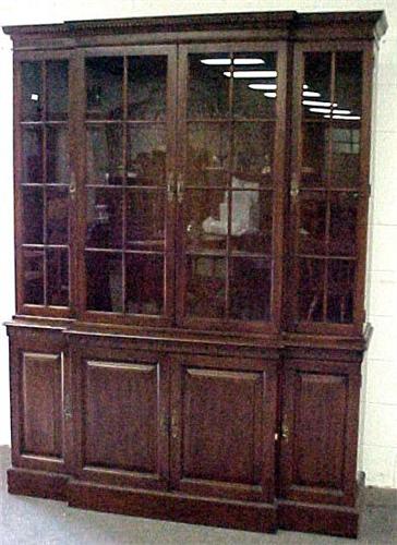 Mahogany two piece breakfront; dentil molding on cornice; two center glass doors flanked by two recessed glass doors; on conforming base with four cabinet doors; mid 20th C. measures approximately 80" high x 62" across x 19" deep (no visible defects) Estimate 300/500