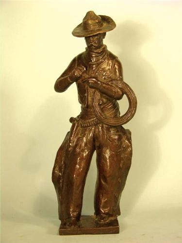 Mahomri Bronze of a Cowboy Rolling a Cigarette. Very well done with great patina. Excellent Condition. 14 inches tall.