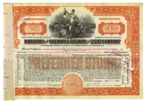 1917, Pennsylvania. Stock certificate for 5 shares. Orange/Black. Vignette of female allegorical figure in foregound and train and machinery in background. Punch, stamp and perferation cancelled. Very fine.