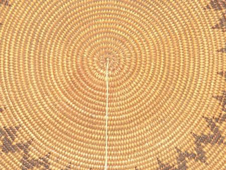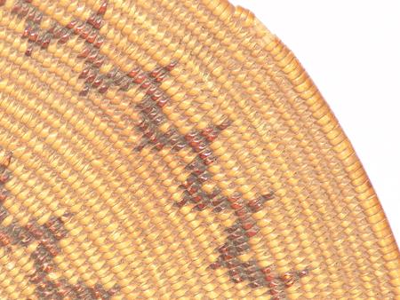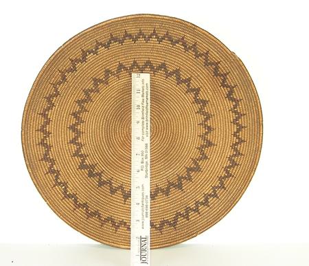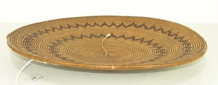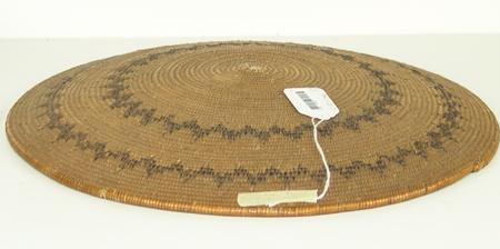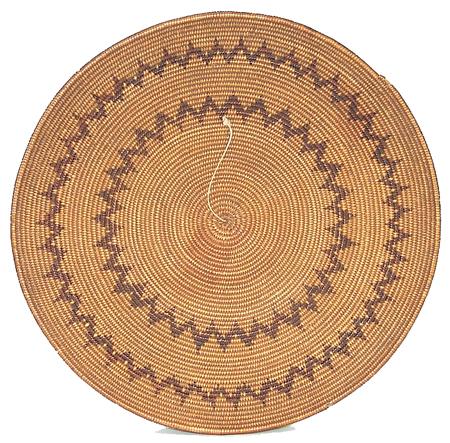 Circa Early 1900s, Beautiful nearly flat basketry tray with two rows of zig-zags done with redfern. Very good condition. 14-1/2" diameter From the Johnson Collection.