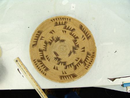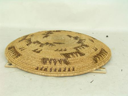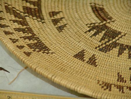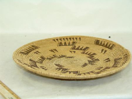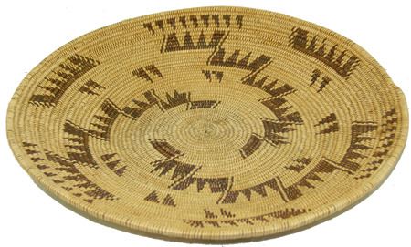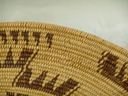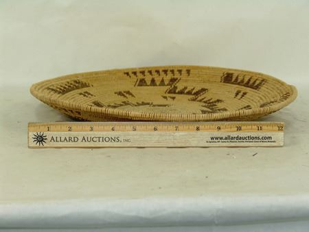 Early 1900s, Rare nearly flat gaming/winnowing tray with interesting geometric figures and symbols done with traditional redbud fern. Very good condition. 2" x 15"