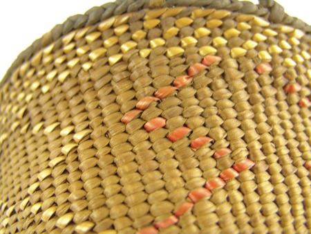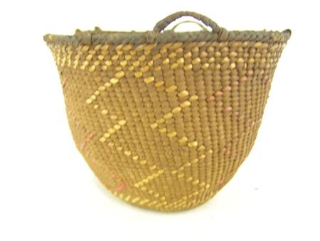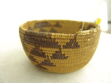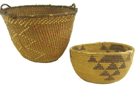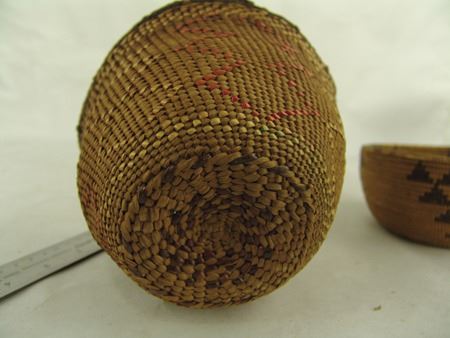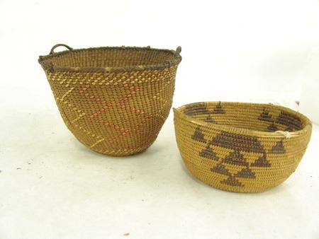 Early/Mid 1900s, Small three rod Maidu bowl with stacked triangles (rim damage, some missing stitches), plus a twined reverse design Quinault bowl with polychrome design (some missing rim loops). Good condition. 3" x 5-1/2", 4-1/2" x 7"