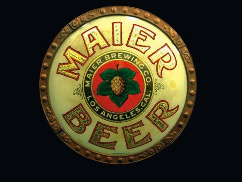Extremely Rare Maier Brewing Co. Reverse Glass Sign, Los Angeles CA. Excellent condition in original tin frame. 19 inch dia overall.