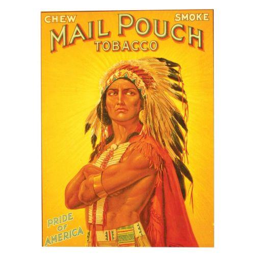 Mail Pouch Tobacco Cardboard sign, Pride of America. Depicting Native American Indian in full head dress. This is the best one of these we have ever seen. Near Mint condition. 14 X 19 1/8 inches.