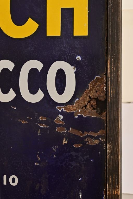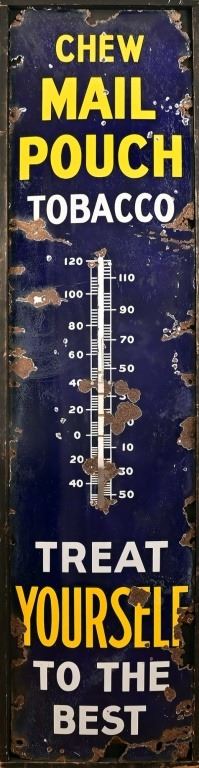"Chew Mail Pouch Tobacco - Treat Yourself To The Best," Rusted and Thermometer is missing. 19 1/2" X 73 1/2"
