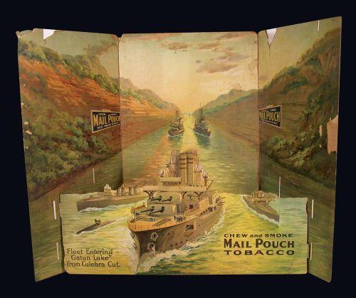 Mail Pouch Tobacco 3 Dimensional Cardboard Window Display. Some tears and paper loss but the colors are strong and the graphics are awsome. There are 2 sets of slots on each side of the backdrop however there is only one insert for the foreground. We had never seen this one before. 36 x 24 inches.