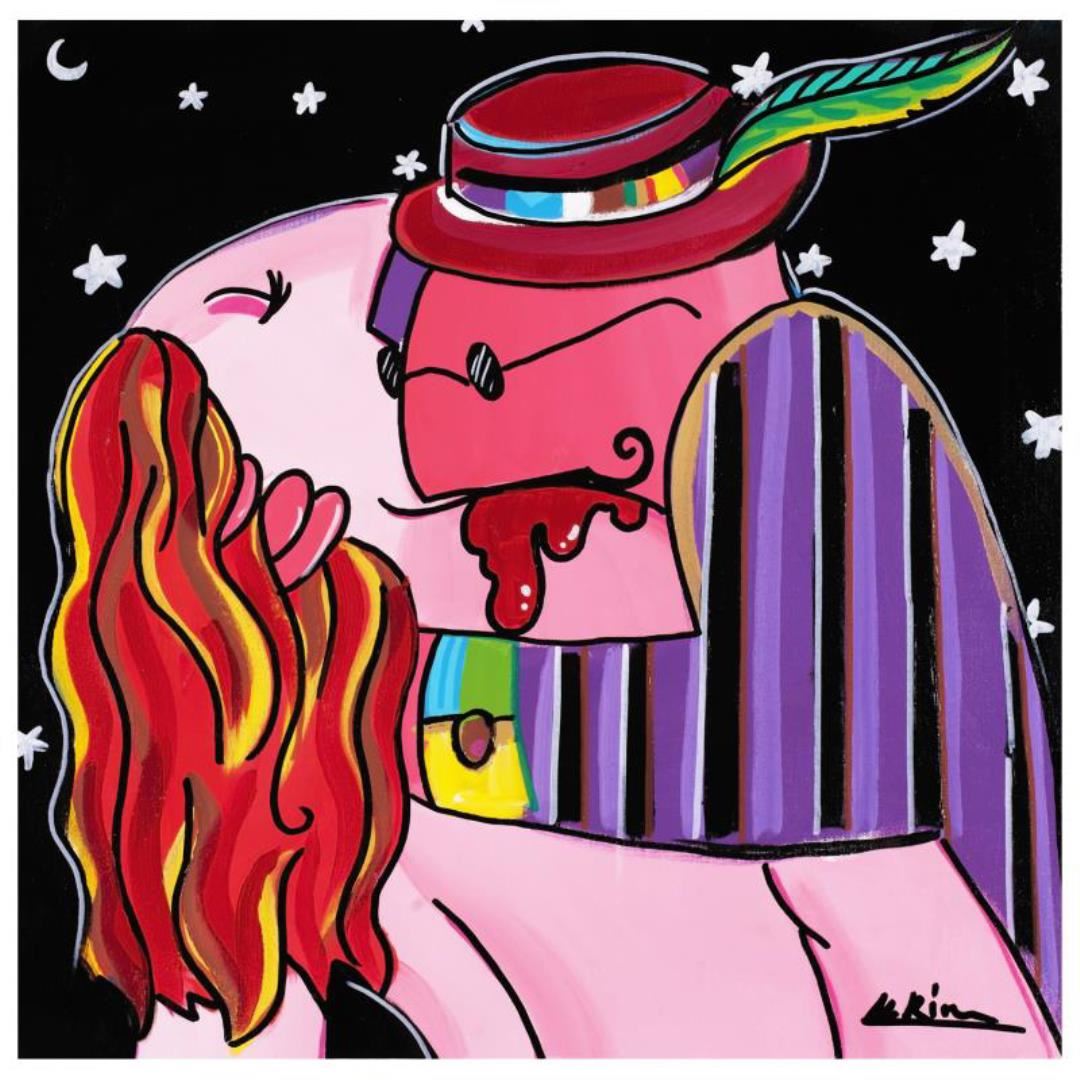 "Night Fall Kiss " is an original acrylic painting on canvas by Rina Maimon, hand signed by the artist and includes a certificate of authenticity. Measures approximately 24" x 24"