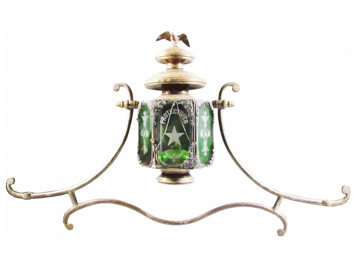 Main Hose Cart Fire Wagon Lantern with mounting bracket. Six sided etched glass. 3 emerald, 3 clear. DeVoursney Bros. NY, Makers. Complete with burner and eagle finial. Front door panel has two cracks, reads "Protectives" with shaded star and foliate design. Additional green panel has small crack on bottom. Missing two sets of grape cluster trim otherwise very good condition. Mounting bracket 35 inches wide X Lantern measures 15 inches tall.