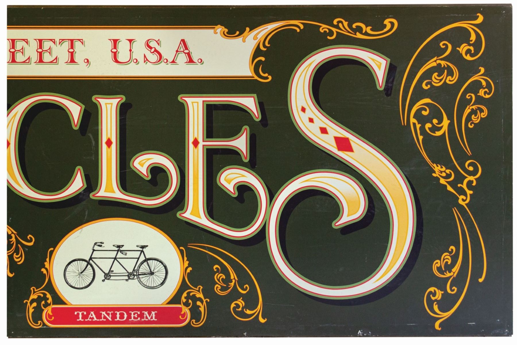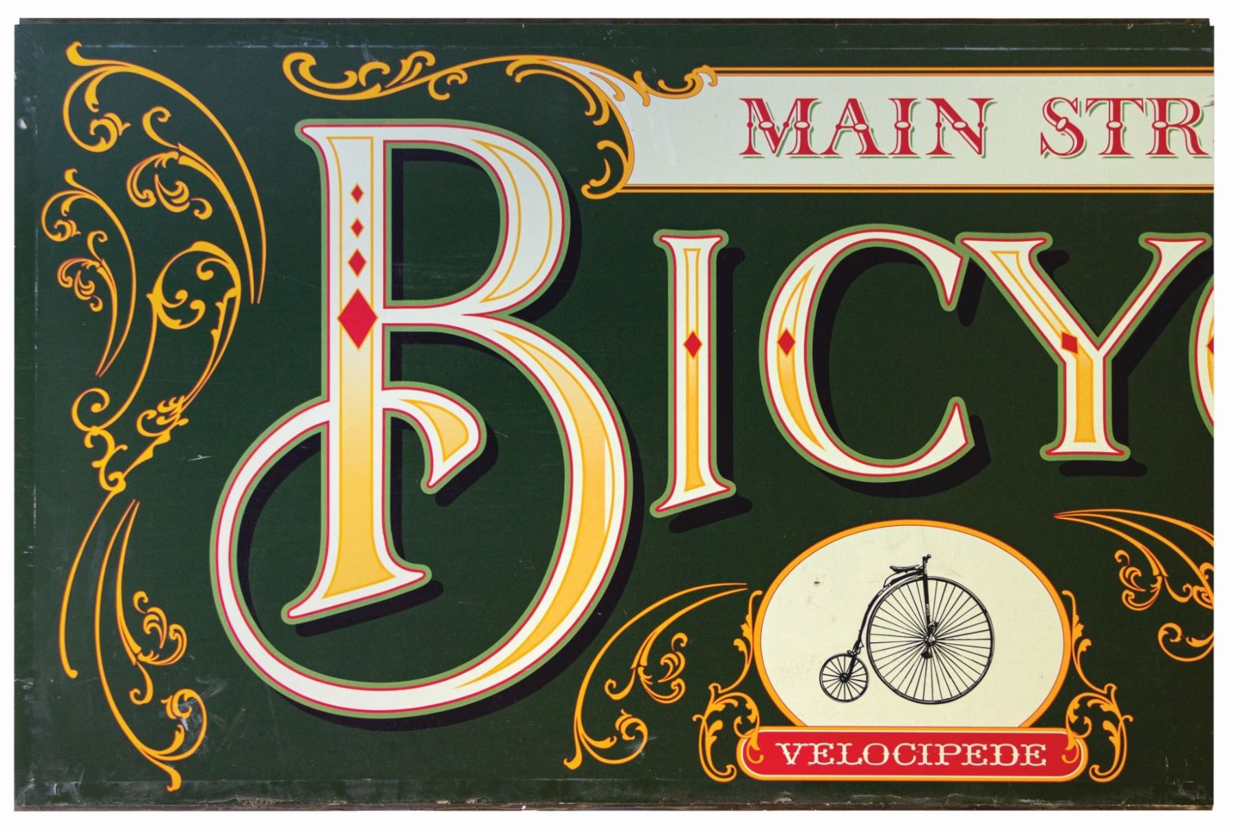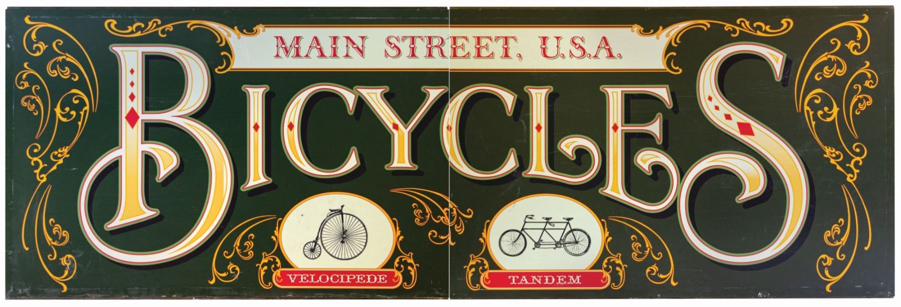 (Walt Disney World, c.2000s) A large sign from Main Street at the Magic Kingdom. Promoting bicycles, with the "velocipede" and "tandem" varieties depicted at the bottom, this large sign also reads "Main Street U.S.A." along the top. Themed signage like this helped to give Main Street an authentic feeling of a 1900s town. Printed in two sections on sturdy and large composite boards, the sign was displayed on one of the Main Street bypass gates. Measuring approximately 47"x142", the sign is in very good overall condition with some expected wear from the sign's use and removal, including some scuffs, scratches,, and general surface wear. This item will require special shipping arrangements. Please contact us for details and estimates.
