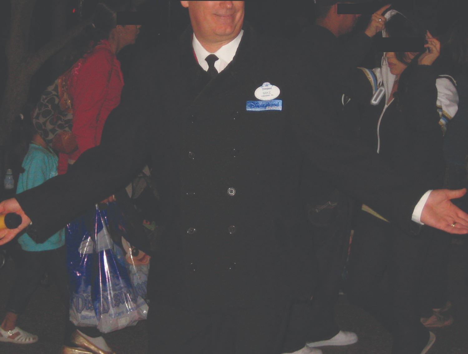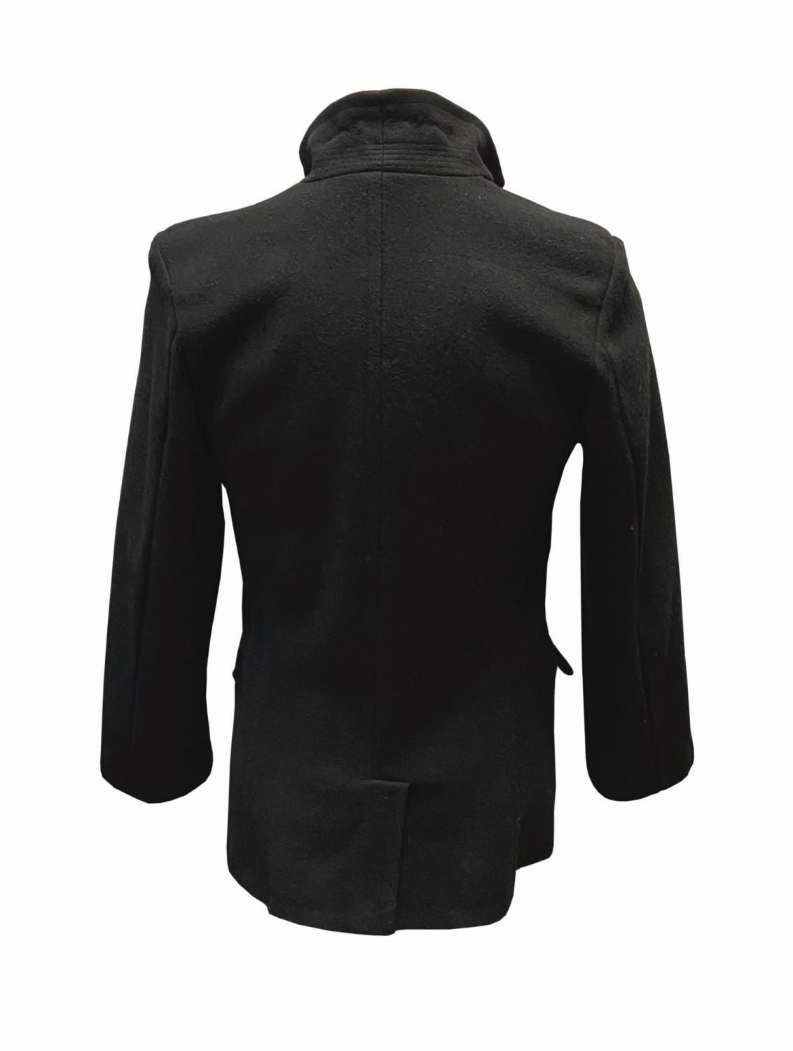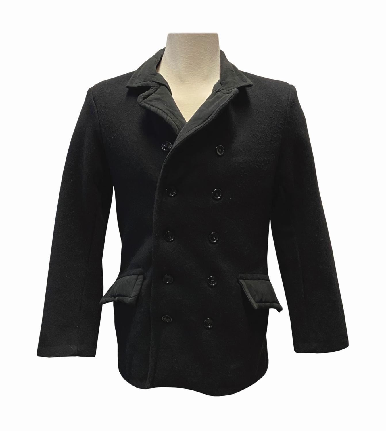 (Disneyland, c.2000s) A winter coat for cast members on Main Street. This black wool coat has a faux suede collar and pocket flaps, and still bears its original Disney Worldwide Services label. The coat is a unisex Medium and is in very good condition, with some wear to the collar and pocket flaps from use.