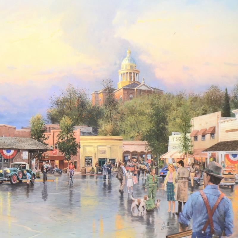 "Main Street Courthouse" is an offset lithograph on paper by Thomas Kinkade (1958-2012), numbered and hand signed by the artist. Includes Certificate of Authenticity from Lighthouse Publishing. Measures approx. 31" x 22" (border), 27" x 18" (image).
