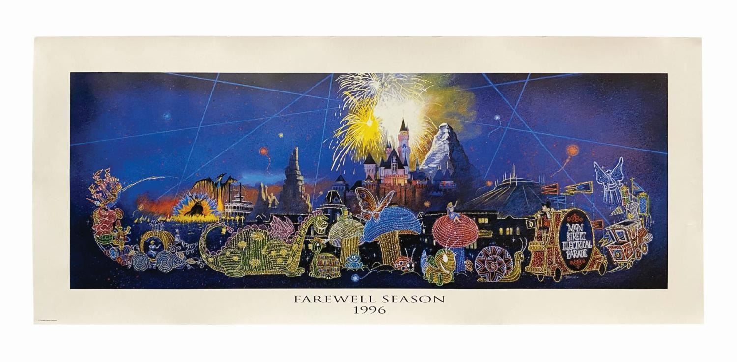 (Disneyland, 1996) A vintage poster print of Imagineer Charles Boyer's iconic Main Street Electrical Parade artwork. This poster was created to commemorate the end of the run for the beloved nighttime multimedia attraction, and the text "Farewell Season 1996" is printed below the image. Measuring 16"x37", the poster is in very good condition with some corner bends, stress lines, light creasing, and handling.