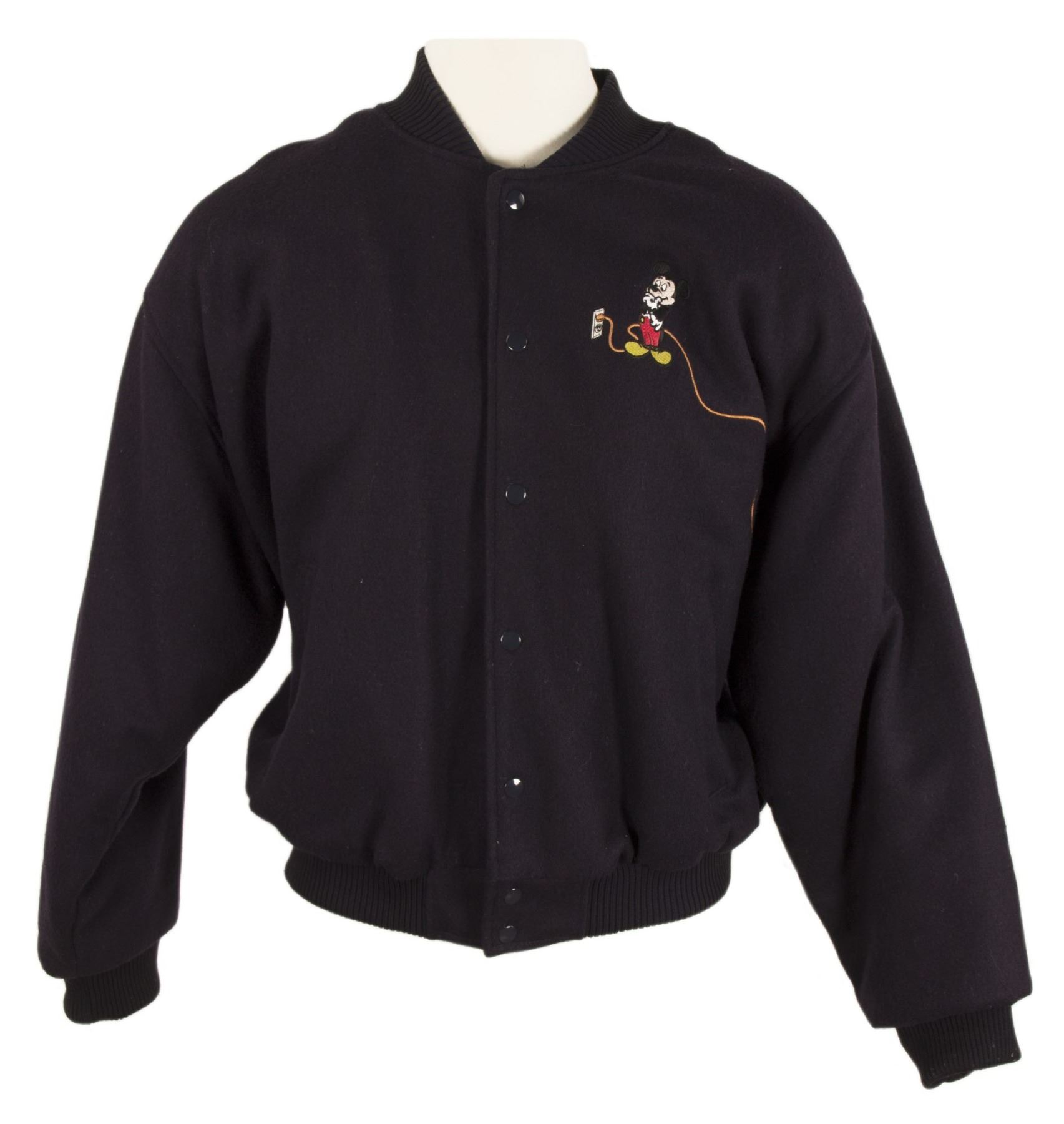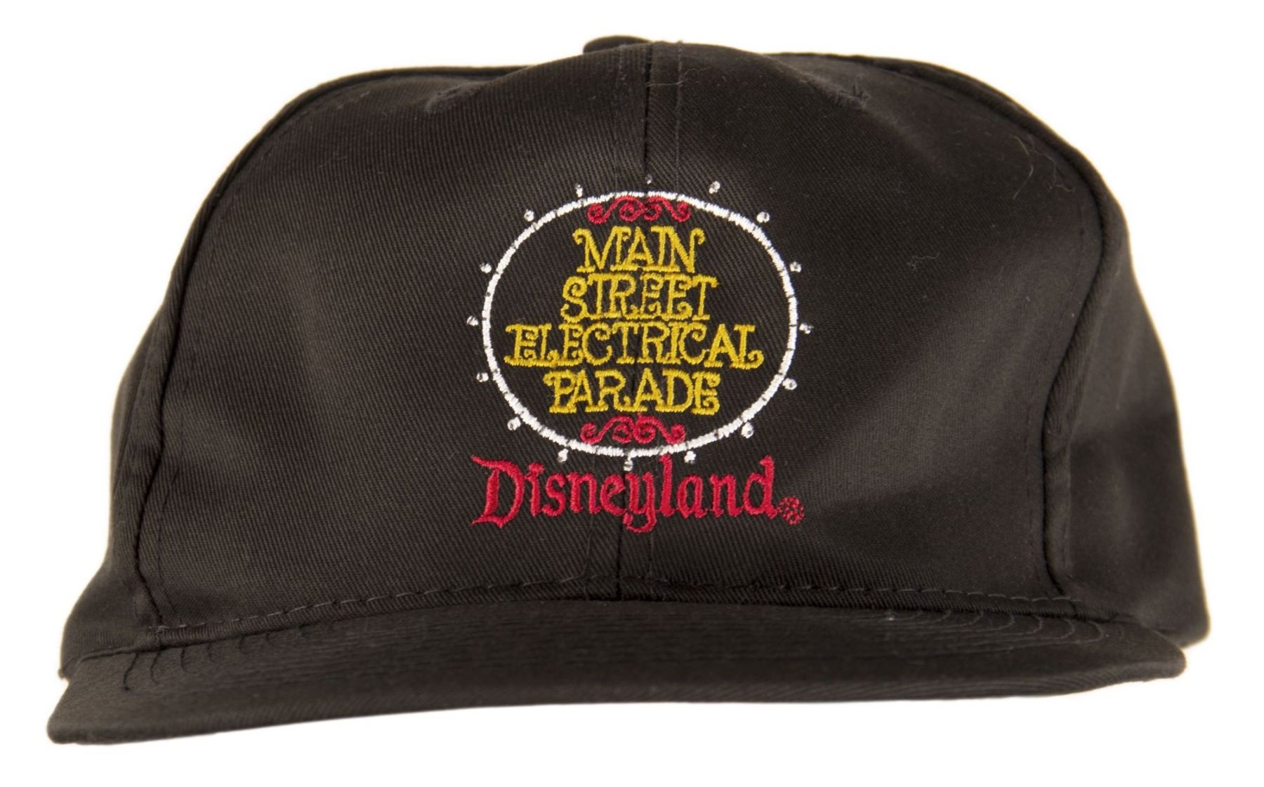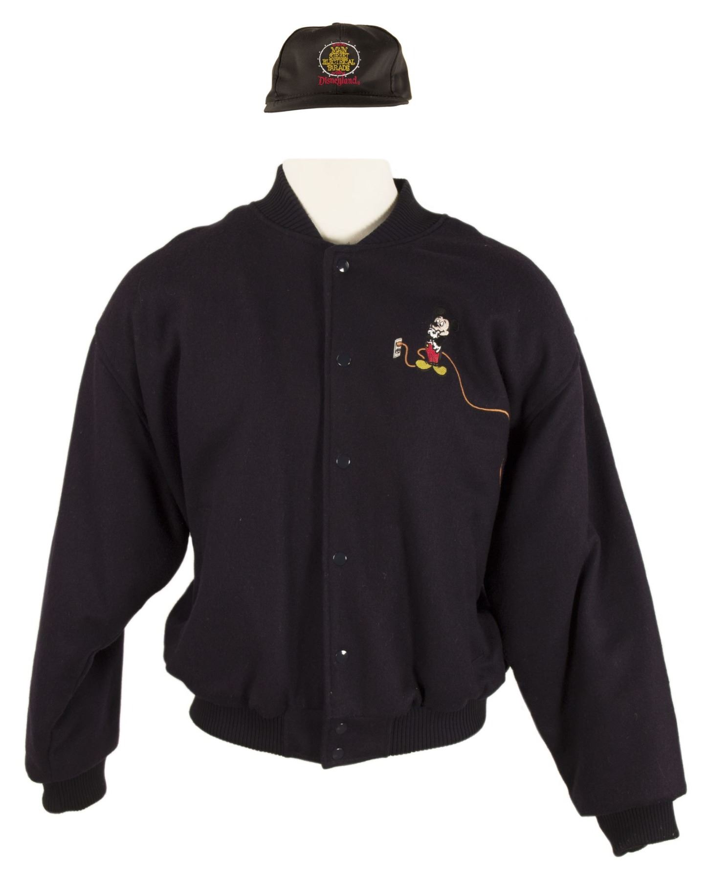 (Disneyland, 1996) A charming bomber jacket and light-up hat celebrating the final season and performance of the Main Street Electrical Parade at Disneyland. The jacket features an embroidered image of Mickey on the front left preparing to pull the plug on the parade, with an embroidered cord which winds around to the gorgeous image of the iconic parade floats on the back. The light-up hat features an embroidered version of the logo with "Final Performance" on the back, and the light-up element is still functional using a 9V battery. The jacket is a size XL and is in very good condition, with minimal wear from use. The hat is in very good condition with some bending due to storage.