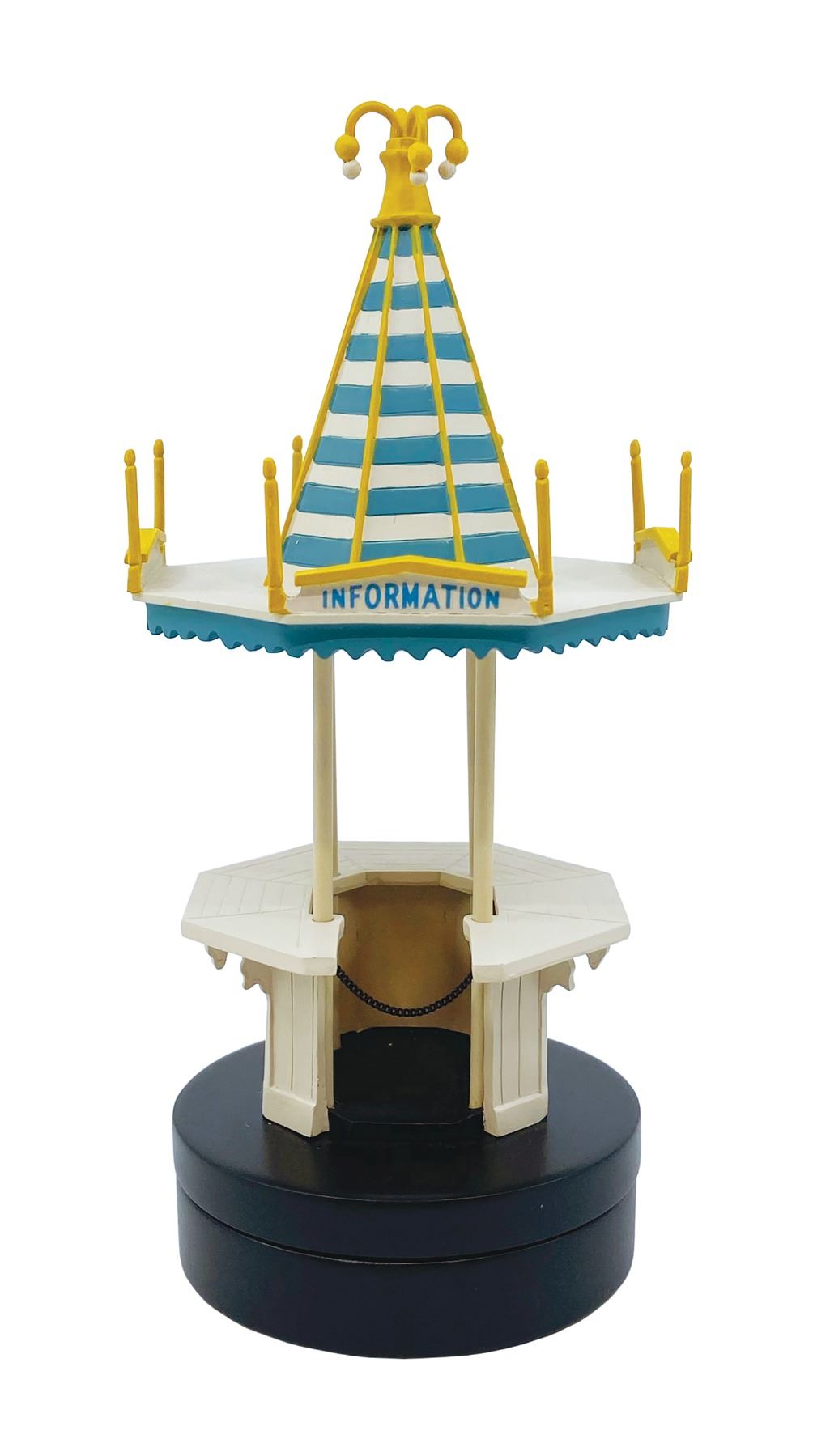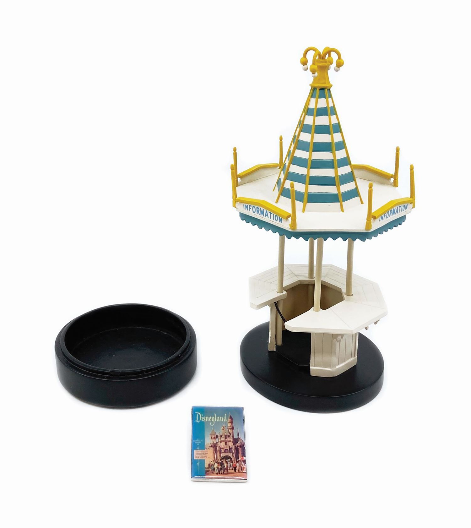(Disneyland, 2005) A rare limited edition ticket booth replica created by Kevin Kidney and Jody Daily as part of Disneyland's 50th anniversary. This replica depicts the Main Street ticket booth and is created in resin, metal, and wood, and was limited to only 1500 pieces. The lid of the base can be removed to reveal a special pin inspired by the original Disneyland guidebooks. This replica measures 3" in diameter and 7.5" tall on its base and is in good condition with minor wear from previous display, including a few small cracks to the rim of the small base compartment.