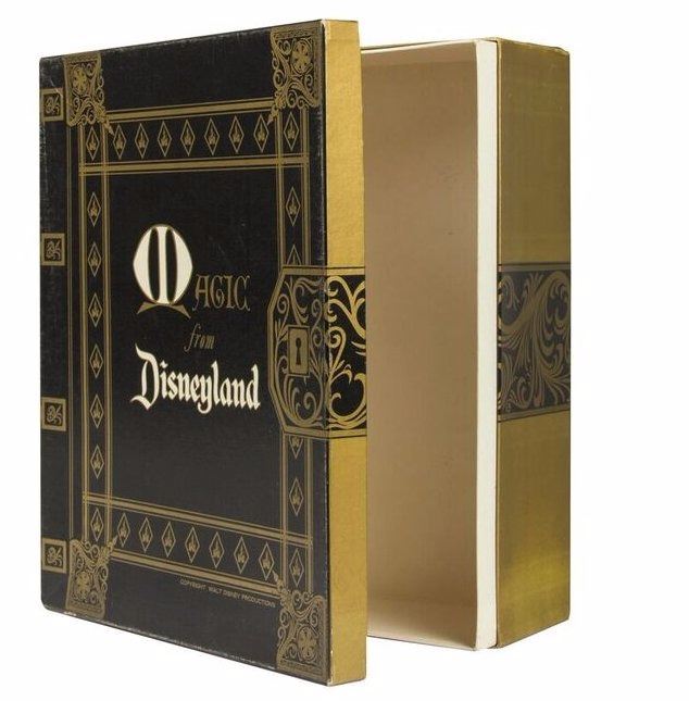 (Disneyland, 1960s) An absolutely stunning bit of Disneyland ephemera from the very rare Magic Shop on Main Street. This large shopping box reads "Magic from Disneyland" on the lid and was used to assemble and sell magic kits as well as for special large purchases. The top of the box is made to appear as an antiquarian book, complete with a faux keyhole lock. This box is extremely rare and measures 12.25"x5.25" and 14.25" tall. This item is in good condition overall with some wear throughout including some small tears in the corners and minor scuffing on the back. The lid is taped to the box on the inside-left edge so that it "hinges" open and closed.