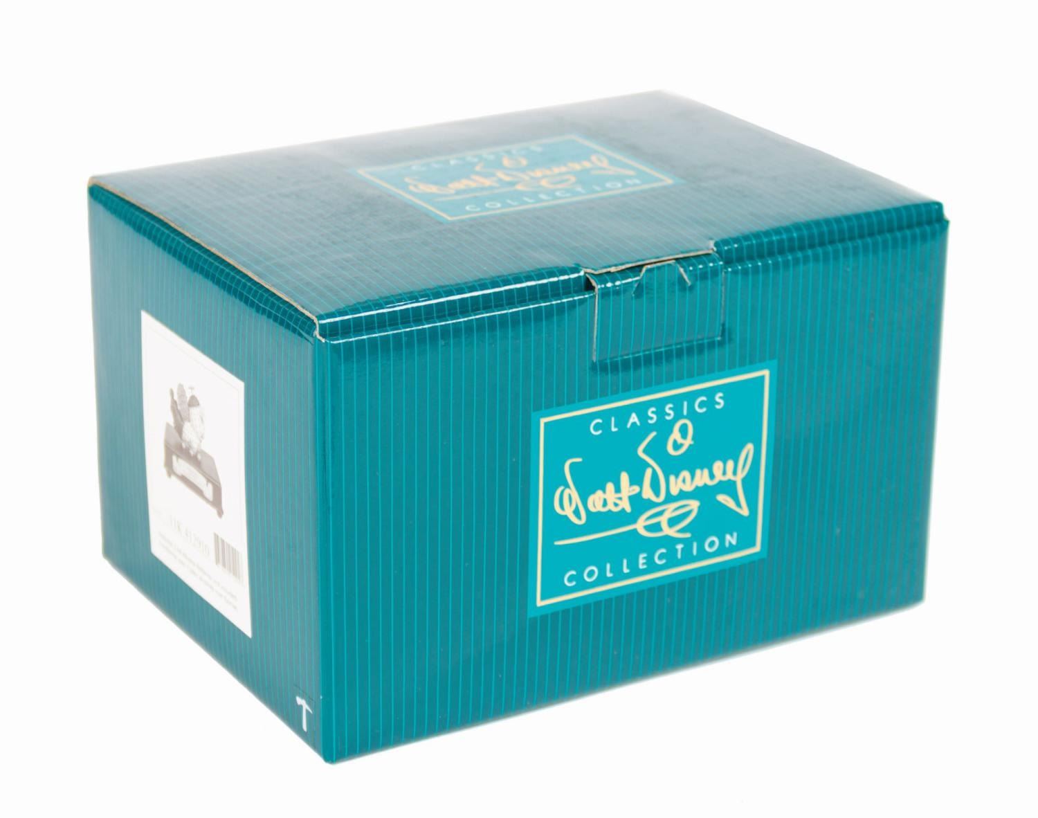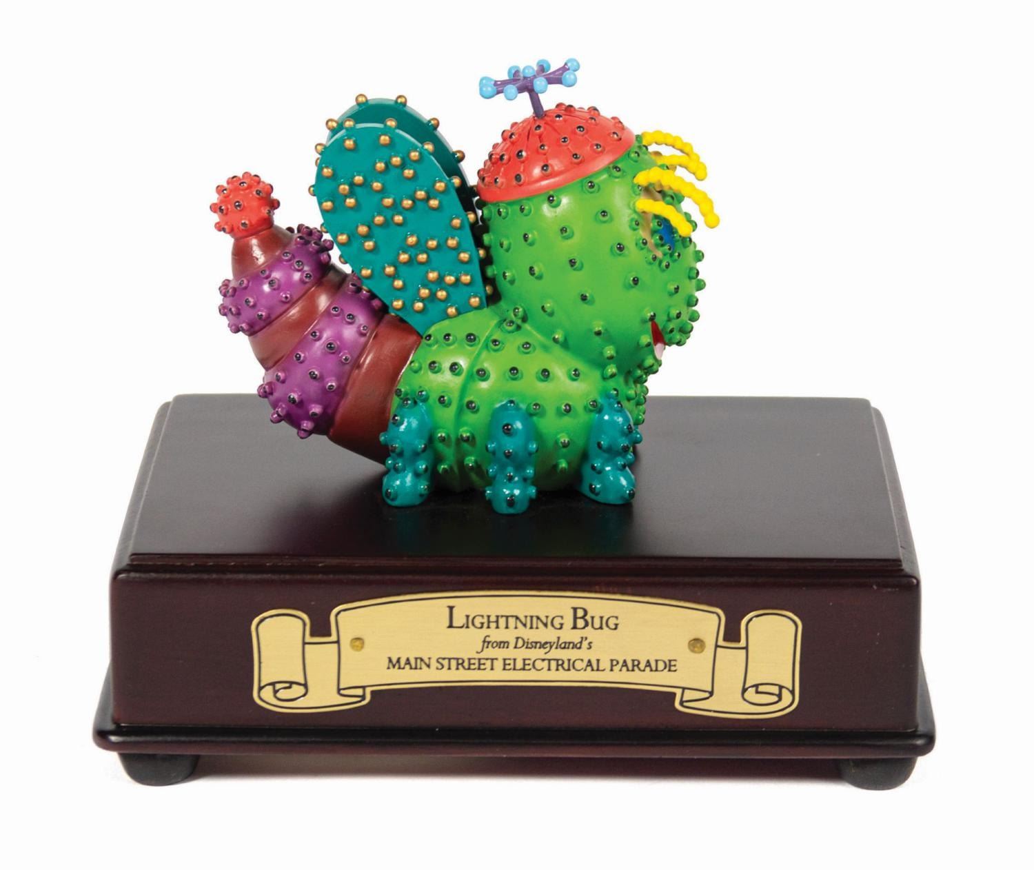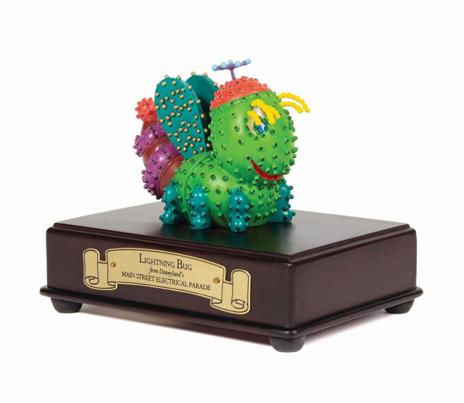 (Disneyland, 2000) A Main Street Electrical Parade Lightning Bug figure from the Walt Disney Classics Collection. Designed by artist Larry Nikolai, this highly detailed cast resin figure is hand painted and affixed to a wooden display base. When a power switch on the base is toggled on, orange and green lights illuminate in the body of the figure, and flash in alternating patterns. The piece is accompanied by its Certificate of Authenticity. Measuring 4.25"x5.25" and 4" deep, the lightning bug is in very fine, as-new condition. The original green WDCC cardboard box packaging is included. It measures 5.75"x9" and 7" deep and has minor finish loss.