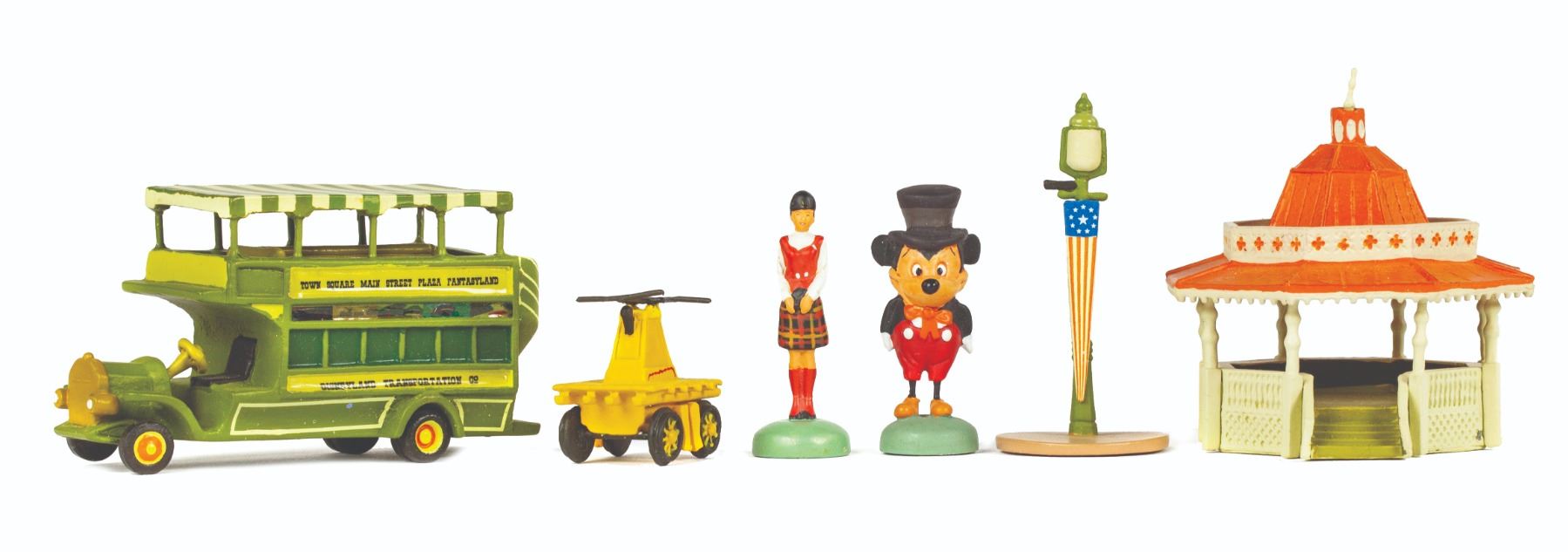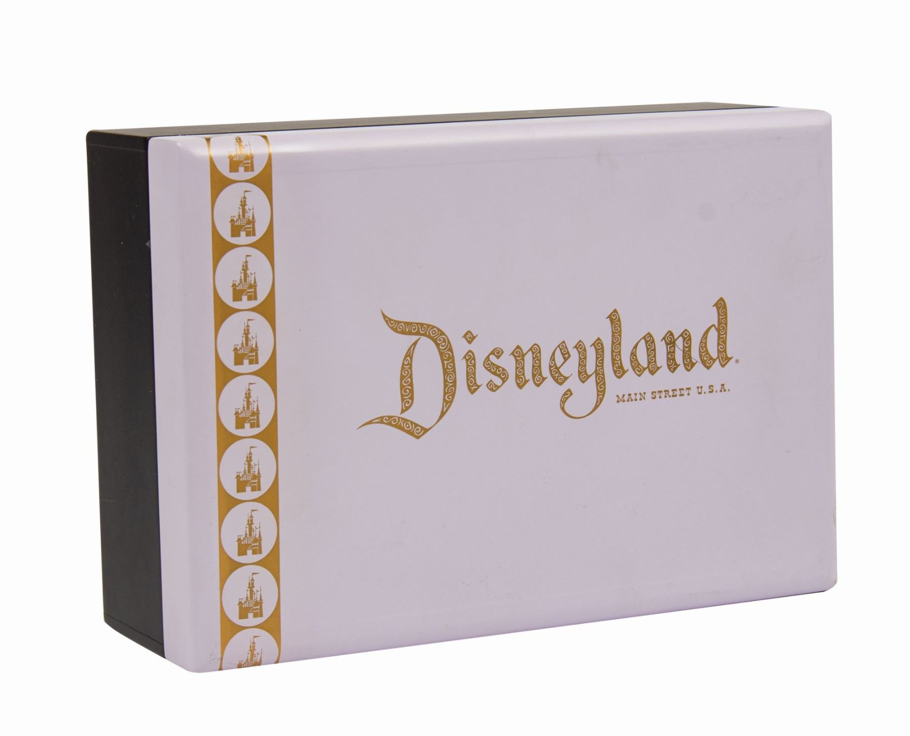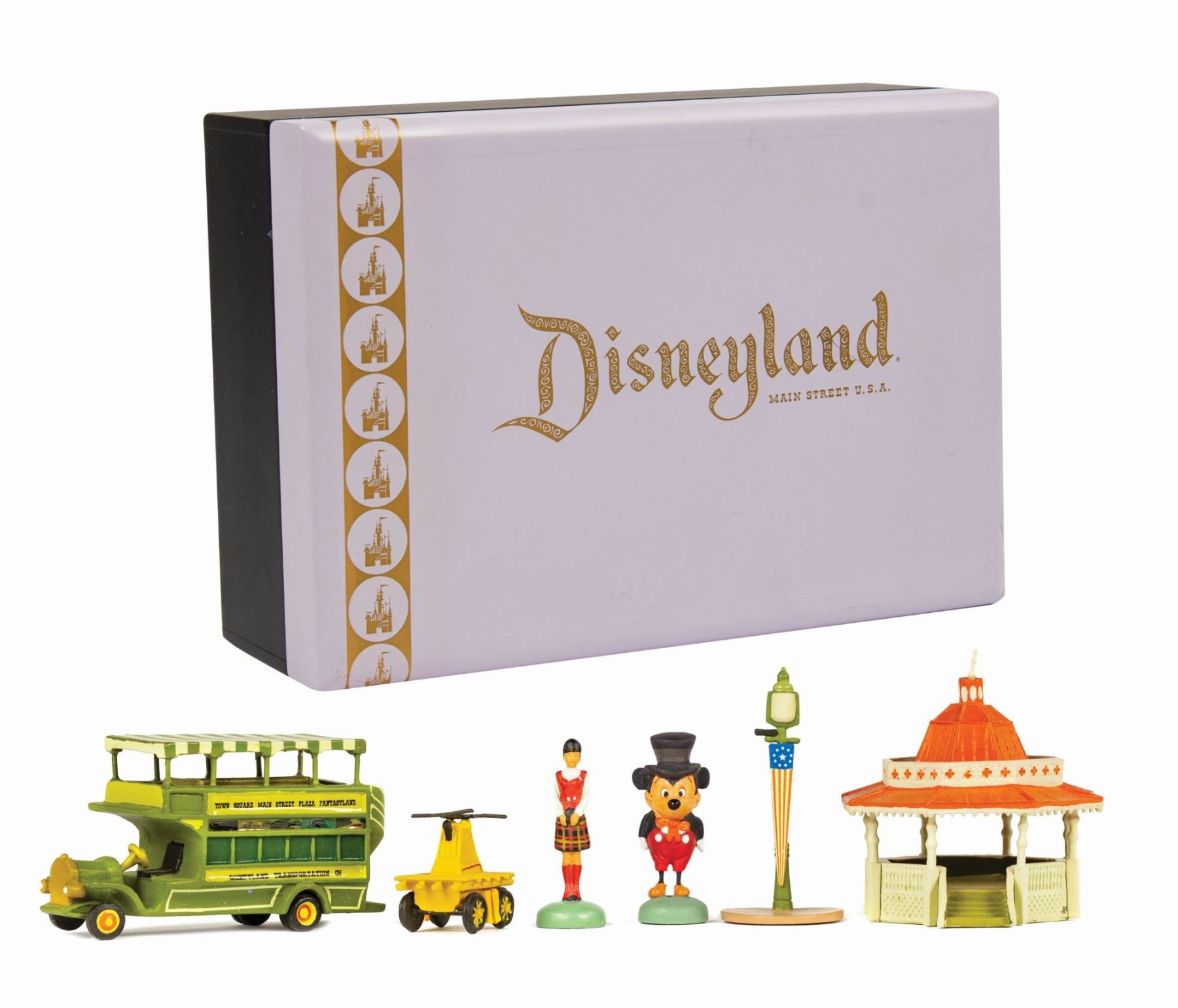 (Disneyland, 2005) A limited edition boxed set of Main Street pewter miniatures created by Kevin Kidney and Jody Daily for Disneyland's 50th Anniversary. This set was limited to 1500 pieces and includes miniatures of: Mickey Mouse, a Main Street double-decker bus, a gazebo, a lamp post, and a cast member tour guide. This boxed set measures 7"x10" and 3.5" tall, and is in very good condition with some scuffing to the box. It comes in its original box and packaging.