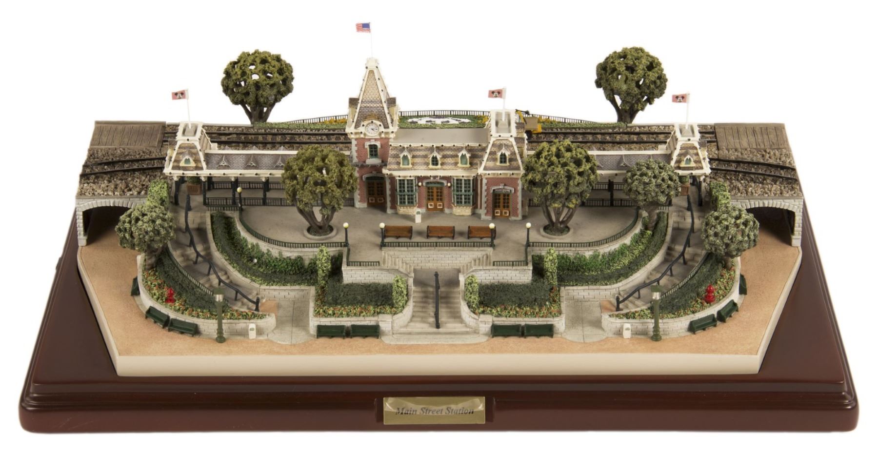 (Disneyland, c.2005) An original scale model of Disneyland's Main Street Station created by renowned miniaturist Robert Olszewski. This model was designed by Olszewski for Disney's incredibly popular Main Street U.S.A. collection of miniatures. This first edition model has lighted elements and comes in its original 50th Commemorative Collection box, with a power cord and a certificate of authenticity. Created in resin with a wooden base and a brass plaque, the model measures approximately 9.5"x14" and 6" tall. The condition is good with minor wear from previous display.