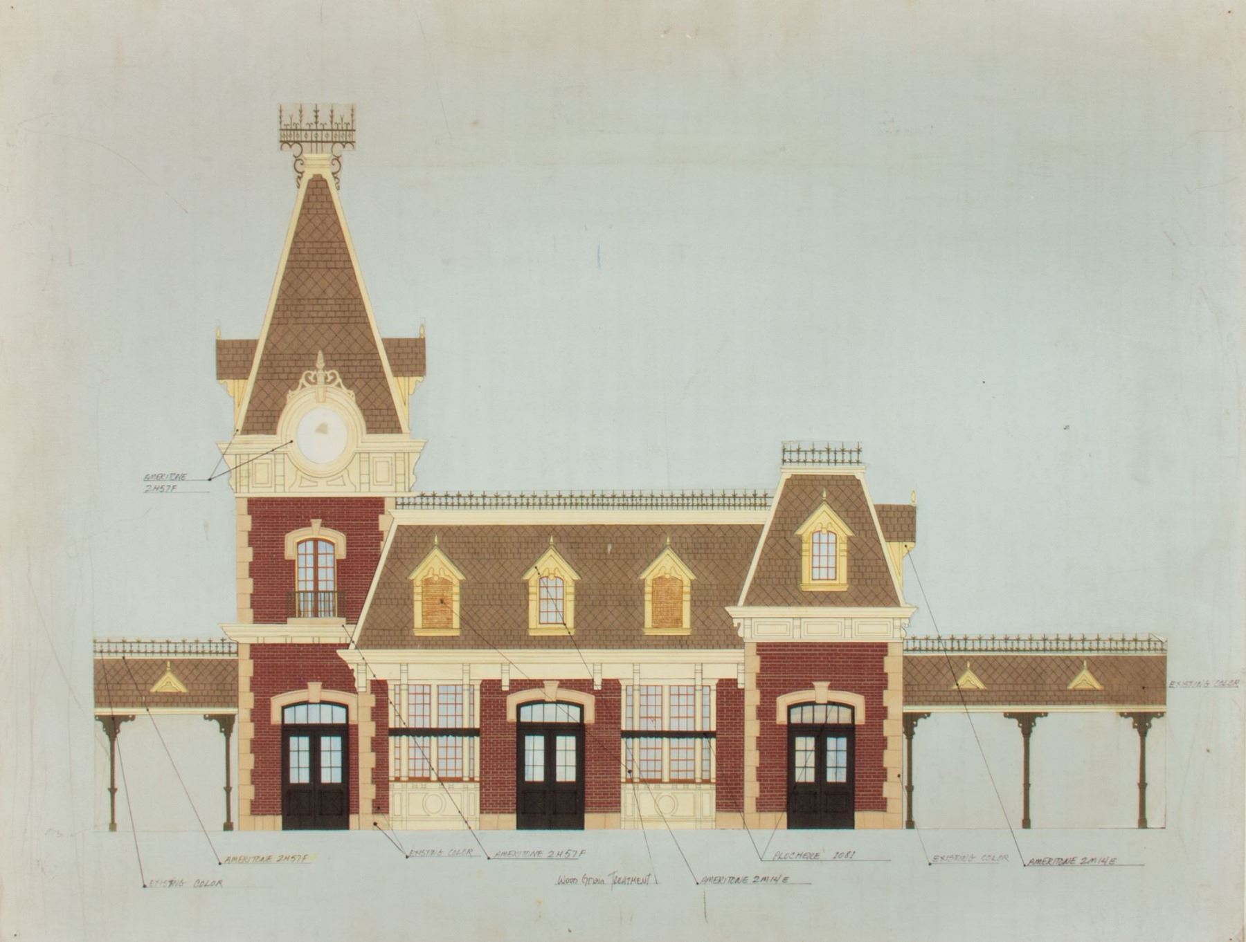 (Disneyland, 1993) A rare Imagineering working print that features an incredible image of the colored elevations for the Main Street Station at Disneyland. This working print is mounted to board and was used during a refurbishment of the Disneyland Railroad's Main Street Station in 1993. The artwork was reproduced from an illustration that was used on an earlier project, and prominently features an iconic view of the Station including its large clock. The back of the artwork features the Walt Disney Company copyright mark. This item measures 22"x31.5" and is in good condition with some scuffing and wear around the border from use.